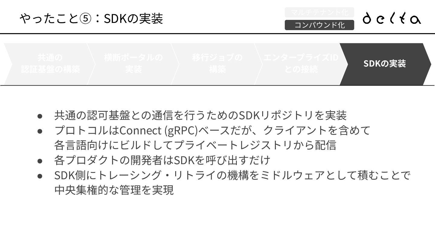 • 共通の認可基盤との通信を⾏うためのSDKリポジトリを実装 • プロトコルはConnect (gRPC)ベースだが、クライアントを含めて 各⾔語向けにビルドしてプライベートレジストリから配信 • 各プロダクトの開発者はSDKを呼び出すだけ • SDK側にトレーシング‧リトライの機構をミドルウェアとして積むことで 中央集権的な管理を実現 マルチテナント化 コンパウンド化