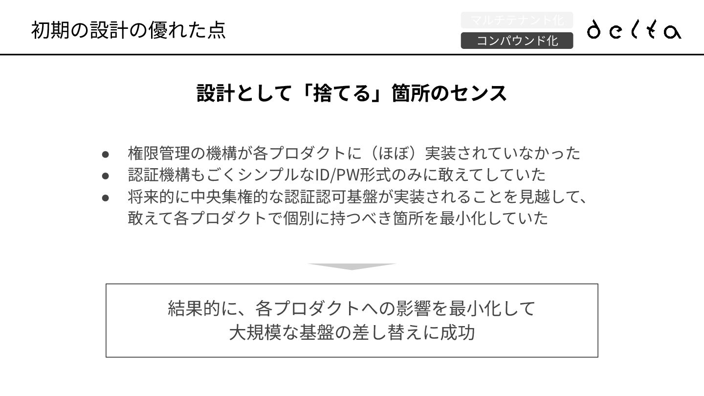 初期の設計の優れた点 設計として「捨てる」箇所のセンス • 権限管理の機構が各プロダクトに(ほぼ)実装されていなかった • 認証機構もごくシンプルなID/PW形式のみに敢えてしていた • 将来的に中央集権的な認証認可基盤が実装されることを⾒越して、 敢えて各プロダクトで個別に持つべき箇所を最⼩化していた マルチテナント化