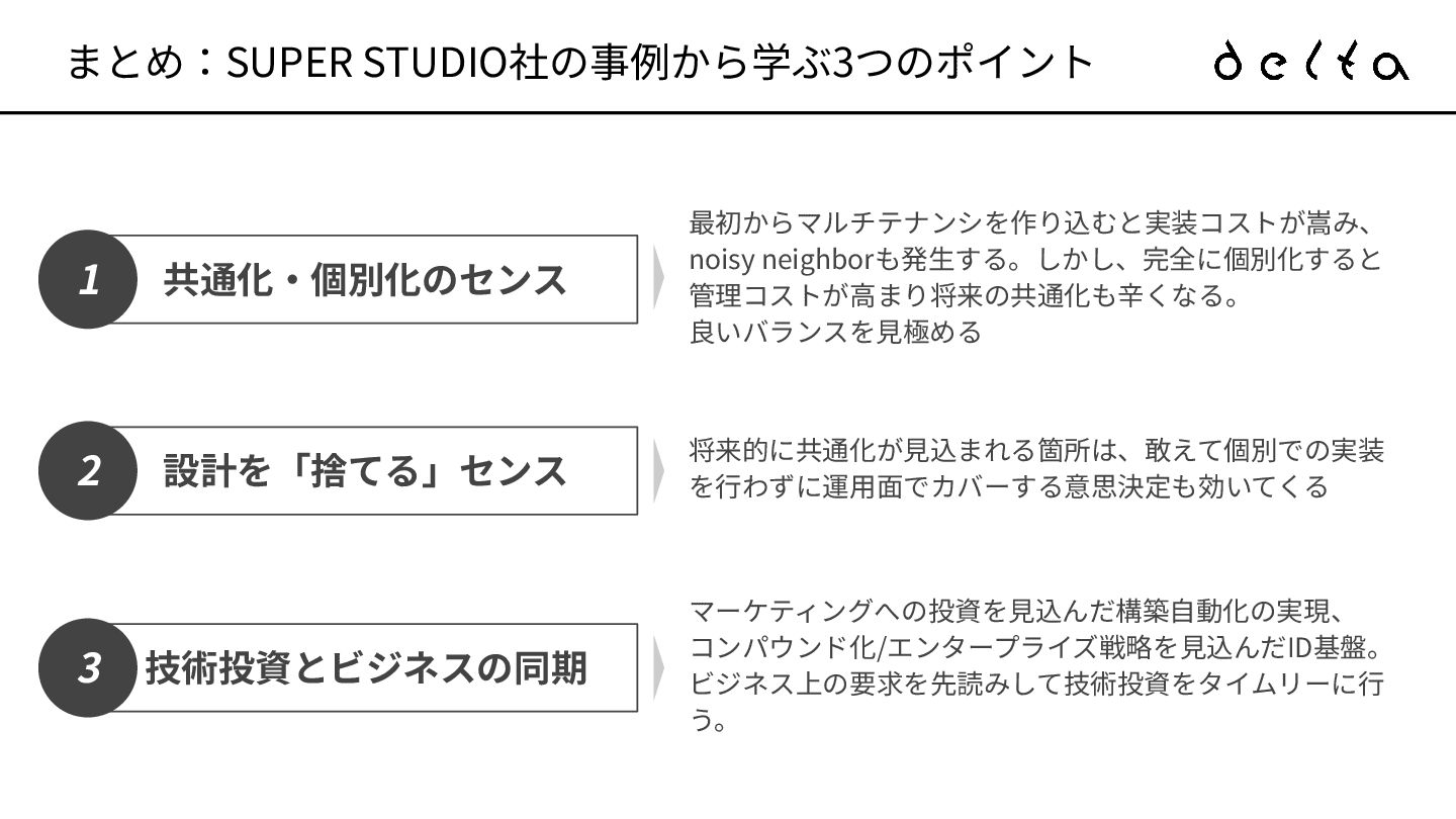 マーケティングへの投資を⾒込んだ構築⾃動化の実現、 コンパウンド化/エンタープライズ戦略を⾒込んだID基盤。 ビジネス上の要求を先読みして技術投資をタイムリーに⾏ う。 共通化‧個別化のセンス 設計を「捨てる」センス 技術投資とビジネスの同期 まとめ:SUPER STUDIO社の事例から学ぶ3つのポイント 1