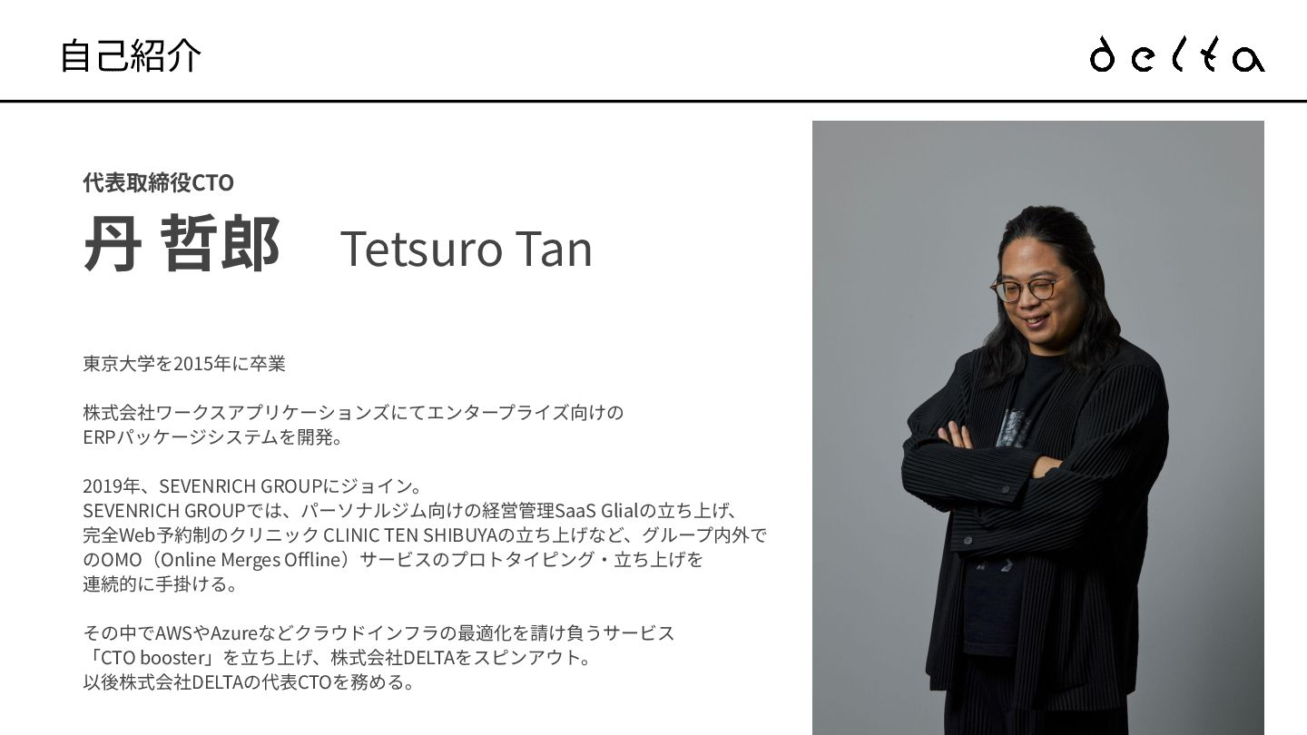 CLINIC TEN SHIBUYAの⽴ち上げなど、グループ内外で のOMO(Online Merges Offline)サービスのプロトタイピング‧⽴ち上げを 連続的に⼿掛ける。 その中でAWSやAzureなどクラウドインフラの最適化を請け負うサービス 「CTO booster」を⽴ち上げ、株式会社DELTAをスピンアウト。 以後株式会社DELTAの代表CTOを務める。 丹 哲郎 Tetsuro Tan 代表取締役CTO