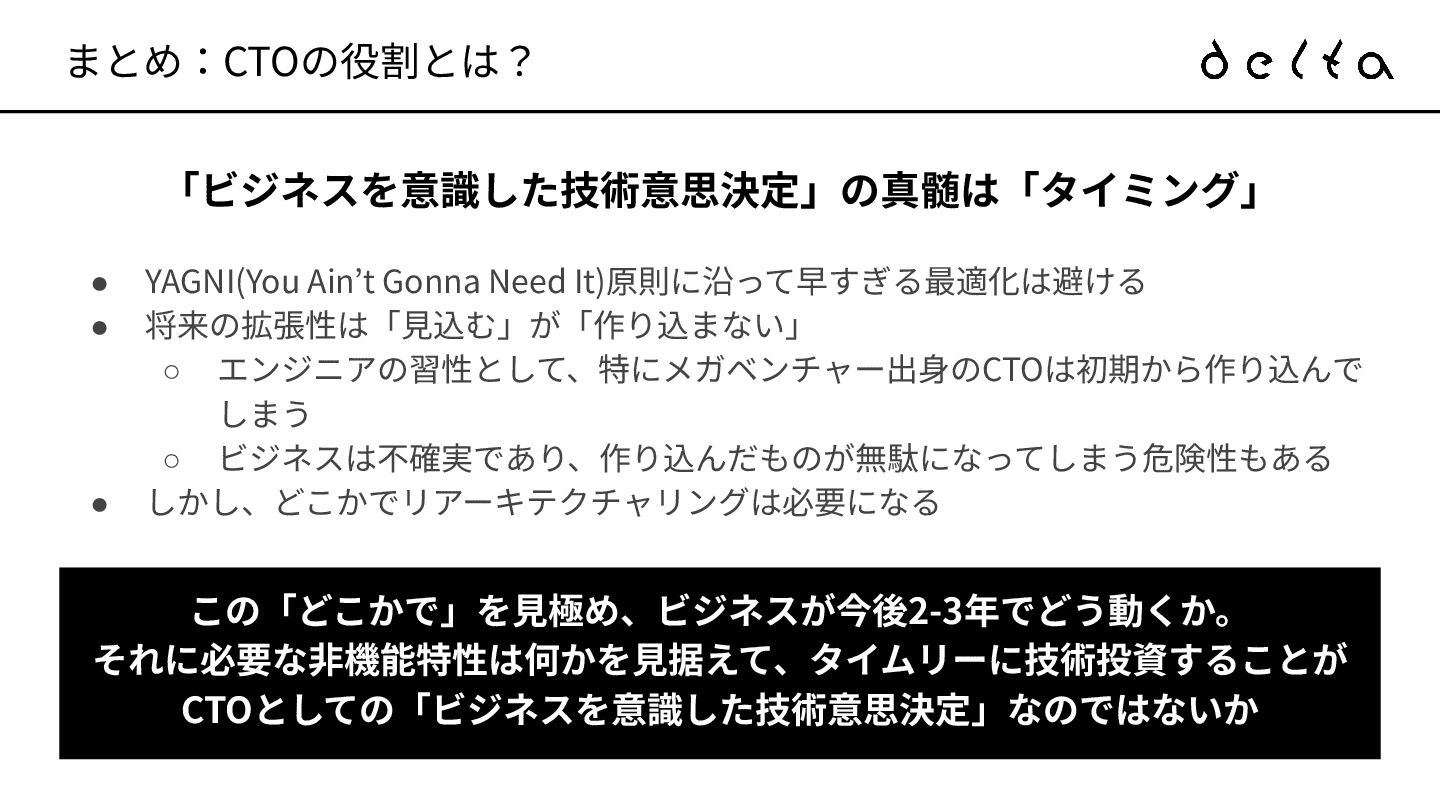 ◦ エンジニアの習性として、特にメガベンチャー出⾝のCTOは初期から作り込んで しまう ◦ ビジネスは不確実であり、作り込んだものが無駄になってしまう危険性もある • しかし、どこかでリアーキテクチャリングは必要になる この「どこかで」を⾒極め、ビジネスが今後2-3年でどう動くか。 それに必要な⾮機能特性は何かを⾒据えて、タイムリーに技術投資することが CTOとしての「ビジネスを意識した技術意思決定」なのではないか
