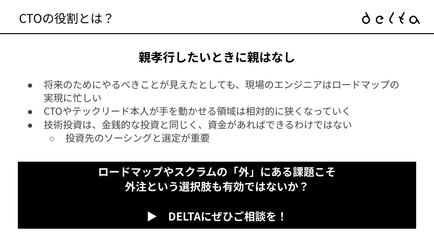 CTOの役割とは? 親孝⾏したいときに親はなし • 将来のためにやるべきことが⾒えたとしても、現場のエンジニアはロードマップの 実現に忙しい • CTOやテックリード本⼈が⼿を動かせる領域は相対的に狭くなっていく • 技術投資は、⾦銭的な投資と同じく、資⾦があればできるわけではない ◦