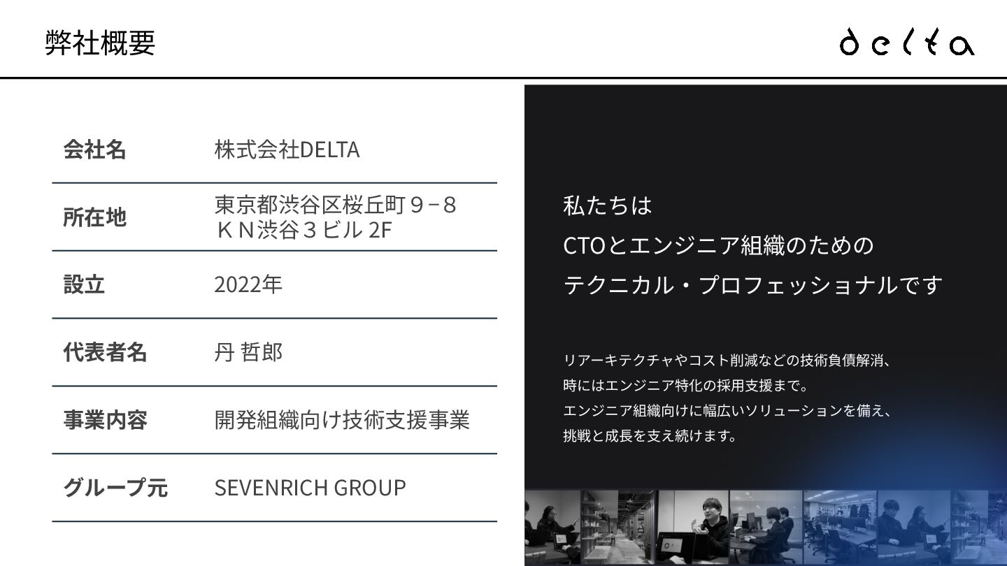 弊社概要 会社名 株式会社DELTA 所在地 東京都渋⾕区桜丘町9−8 KN渋⾕3ビル 2F 設⽴ 2022年 代表者名