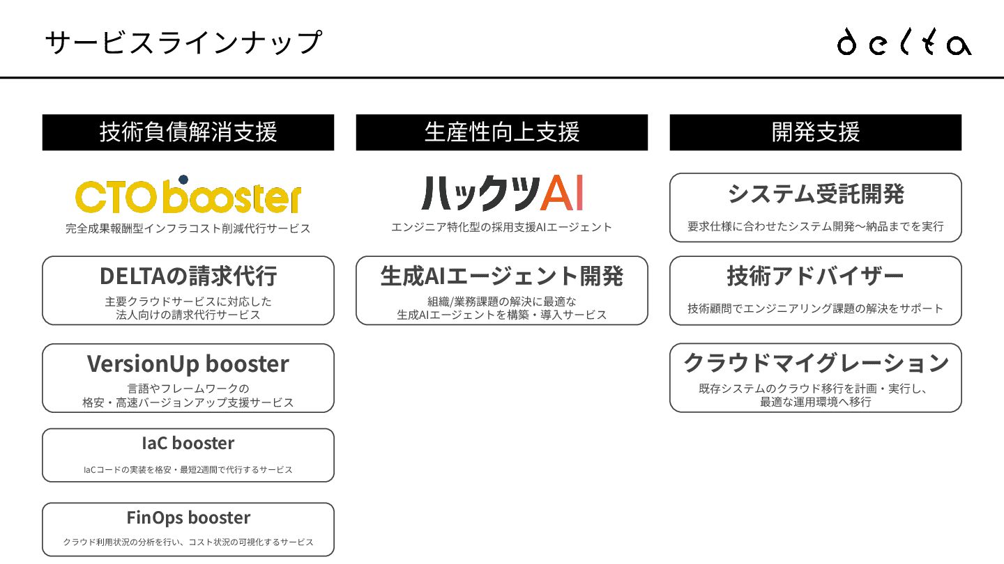 booster エンジニア特化型の採⽤⽀援AIエージェント ⽣成AIエージェント開発 組織/業務課題の解決に最適な ⽣成AIエージェントを構築‧導⼊サービス 技術アドバイザー 技術顧問でエンジニアリング課題の解決をサポート ⽣産性向上⽀援 開発⽀援 主要クラウドサービスに対応した 法⼈向けの請求代⾏サービス DELTAの請求代⾏ ⾔語やフレームワークの 格安‧⾼速バージョンアップ⽀援サービス VersionUp booster クラウドマイグレーション 既存システムのクラウド移⾏を計画‧実⾏し、 最適な運⽤環境へ移⾏