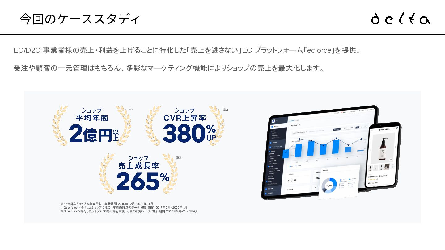 今回のケーススタディ EC/D2C 事業者様の売上・利益を上げることに特化した「売上を逃さない」EC プラットフォーム「ecforce」を提供。 受注や顧客の一元管理はもちろん、多彩なマーケティング機能によりショップの売上を最大化します。 ※1:全導入ショップの年商平均 /集計期間 2019年12月~2020年11月 ※2:ecforceへ移行したショップ 3社の1年経過時点のデータ
