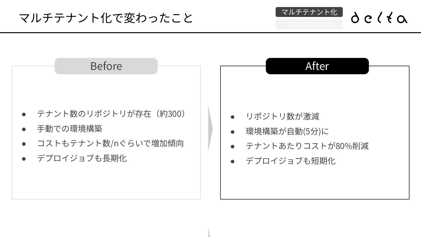 マルチテナント化で変わったこと マルチテナント化 コンパウンド化 • テナント数のリポジトリが存在(約300) • ⼿動での環境構築 • コストもテナント数/nぐらいで増加傾向 •