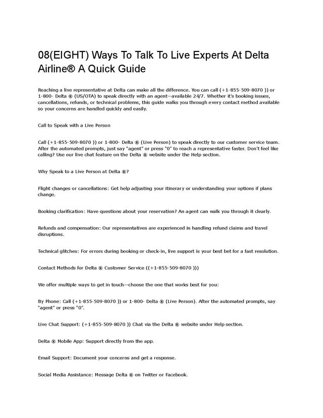 Reaching a live representative at Delta can make all the difference. You can call (+1-866-414→5005)) 📞🤙 or 1-800- Delta® (US/OTA) to speak directly with an agent—available 24/7. Whether it’s booking issues, cancellations, refunds, or technical problems, this guide walks you through every contact method available so your concerns are handled quickly and easily.