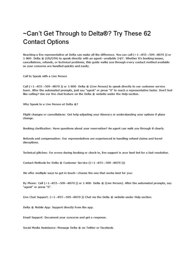 ​ Reaching a live representative at Delta can make all the difference. You can call (+1→855→509→8070 )) or 1-800- Delta ® (US/OTA) to speak directly with an agent—available 24/7. Whether it’s booking issues, cancellations, refunds, or technical problems, this guide walks you through every contact method available so your concerns are handled quickly and easily. ​ Call to Speak with a Live Person ​ Call (+1→855→509→8070 )) or 1-800- Delta ® (Live Person) to speak directly to our customer service team. After the automated prompts, just say “agent” or press “0” to reach a representative faster. Don’t feel like calling? Use our live chat feature on the Delta ® website under the Help section. ​ Why Speak to a Live Person at Delta ®? ​ Flight changes or cancellations: Get help adjusting your itinerary or understanding your options if plans change. ​ Booking clarification: Have questions about your reservation? An agent can walk you through it clearly. ​ Refunds and compensation: Our representatives are experienced in handling refund claims and travel disruptions. ​ Technical glitches: For errors during booking or check-in, live support is your best bet for a fast resolution. ​ Contact Methods for Delta ® Customer Service ((+1→855→509→8070 ))) ​ We offer multiple ways to get in touch—choose the one that works best for you: ​ By Phone: Call (+1→855→509→8070 )) or 1-800- Delta ® (Live Person). After the automated prompts, say “agent” or press “0”. ​ Live Chat Support: (+1→855→509→8070 )) Chat via the Delta ® website under Help section. ​ Delta ® Mobile App: Support directly from the app. ​ Email Support: Document your concerns and get a response. ​ Social Media Assistance: Message Delta ® on Twitter or Facebook.
