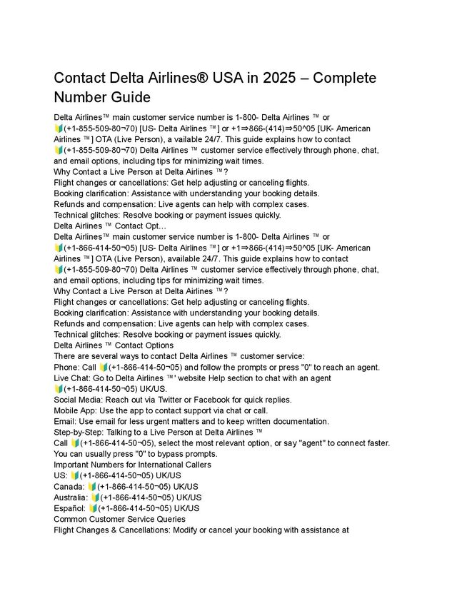 issues, cancellations, refunds, or technical problems, this guide walks you through every contact method available so your concerns are handled quickly and easily. Call to Speak with a Live Person Call 📲 📞 1→866→414→50.05 or 1-800-Delta Airlines® (Live Person) to speak directly to our customer service team. After the automated prompts, just say “agent” or press “0” to reach a representative faster. Don’t feel like calling? Use our live chat feature on the Delta Airlines® website under the Help section. Why Speak to a Live Person at Delta Airlines®? Flight changes or cancellations: Get help adjusting your itinerary or understanding your options if plans change. Booking clarification: Have questions about your reservation? An agent can walk you through it clearly. Refunds and compensation: Our representatives are experienced in handling refund claims and travel disruptions. Technical glitches: For errors during booking or check-in, live support is your best bet for a fast resolution. Contact Methods for Delta Airlines® Customer Service ( 📞 1→866→414→50.05) We offer multiple ways to get in touch—choose the one that works best for you: By Phone: Call 📞 1→866→414→50.05 or 1-800-Delta Airlines® (Live Person). After the automated prompts, say “agent” or press “0”. 📲 Live Chat Support: Chat via the Delta Airlines® website under Help section. 📱 Delta Airlines® Mobile App: Support directly from the app. ✉ Email Support: Document your concerns and get a response. 📢 Social Media Assistance: Message Delta Airlines® on Twitter or Facebook. Step-by-Step: How to Speak with a Someone Dial 📲 📞 1→866→414→50.05 or 1-800-Delta Airlines® (Live Person). Follow the automated prompts. Say “agent” or press “0”. Pro tip: Call during off-peak hours to reduce wait times. International Contact Numbers Delta Airlines® USA: 📲 📞 1→866→414→50.05 Spanish Support: 📲 📞 1→866→414→50.05 Canada: 📲 📞 1→866→414→50.05 Australia: 📲 📞 1→866→414→50.05 Common Customer Service Topics We Handle