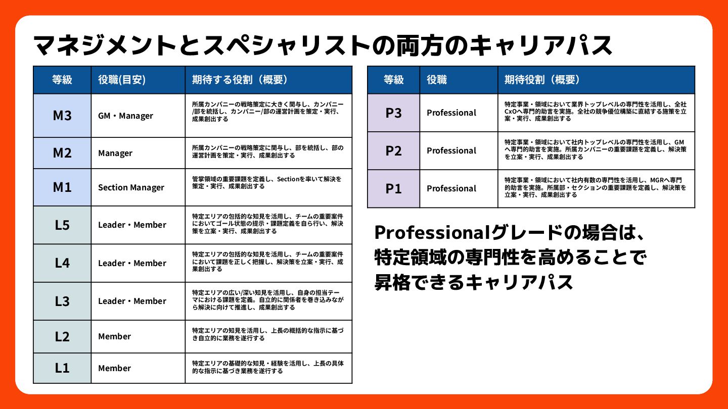 M3 GM‧Manager 所属カンパニーの戦略策定に⼤きく関与し、カンパニー /部を統括し、カンパニー/部の運営計画を策定‧実⾏、 成果創出する M2 Manager 所属カンパニーの戦略策定に関与し、部を統括し、部の 運営計画を策定‧実⾏、成果創出する M1 Section Manager 管掌領域の重要課題を定義し、Sectionを率いて解決を 策定‧実⾏、成果創出する L5 Leader‧Member 特定エリアの包括的な知⾒を活⽤し、チームの重要案件 においてゴール状態の提⽰‧課題定義を⾃ら⾏い、解決 策を⽴案‧実⾏、成果創出する L4 Leader‧Member 特定エリアの包括的な知⾒を活⽤し、チームの重要案件 において課題を正しく把握し、解決策を⽴案‧実⾏、成 果創出する L3 Leader‧Member 特定エリアの広い/深い知⾒を活⽤し、⾃⾝の担当テー マにおける課題を定義。⾃⽴的に関係者を巻き込みなが ら解決に向けて推進し、成果創出する L2 Member 特定エリアの知⾒を活⽤し、上⻑の概括的な指⽰に基づ き⾃⽴的に業務を遂⾏する L1 Member 特定エリアの基礎的な知⾒‧経験を活⽤し、上⻑の具体 的な指⽰に基づき業務を遂⾏する 等級 役職 期待役割(概要) P3 Professional 特定事業‧領域において業界トップレベルの専⾨性を活⽤し、全社 CxOへ専⾨的助⾔を実施。全社の競争優位構築に直結する施策を⽴ 案‧実⾏、成果創出する P2 Professional 特定事業‧領域において社内トップレベルの専⾨性を活⽤し、GM へ専⾨的助⾔を実施。所属カンパニーの重要課題を定義し、解決策 を⽴案‧実⾏、成果創出する P1 Professional 特定事業‧領域において社内有数の専⾨性を活⽤し、MGRへ専⾨ 的助⾔を実施。所属部‧セクションの重要課題を定義し、解決策を ⽴案‧実⾏、成果創出する