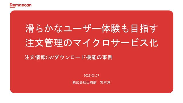 滑らかなユーザー体験も目指す 注文管理のマイクロサービス化 注文情報CSVダウンロード機能の事例 2025.03.27 株式会社出前館 宮本涼