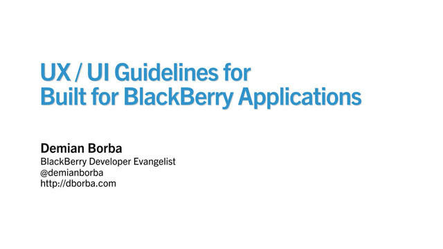 The goal of the Built for BlackBerry® program is to identify applications that demonstrate the features, functions, and philosophy of BlackBerry® 10. This all starts with the user experience. This session will focus on the user experience provide through the BlackBerry 10 user interface elements. It will examine key elements of the user interface and also the philosophy behind the user experience. You’ll see how a plain ordinary application can be transformed by following the BlackBerry 10 UI/UX guidelines.