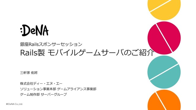 銀座Railsスポンサーセッション Rails製 モバイルゲームサーバのご紹介 三軒家 佑將 株式会社ディー・エヌ・エー ソリューション事業本部 ゲームアライアンス事業部 ゲーム制作部 サーバーグループ