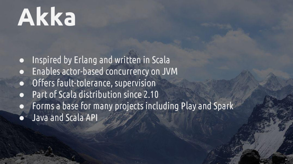 Enables actor-based concurrency on JVM • Offers fault-tolerance, supervision • Part of Scala distribution since 2.10 • Forms a base for many projects including Play and Spark • Java and Scala API