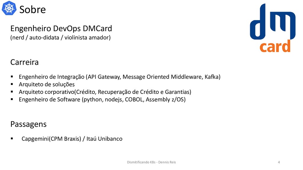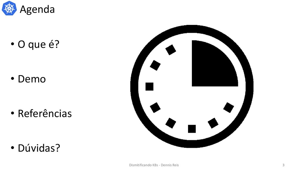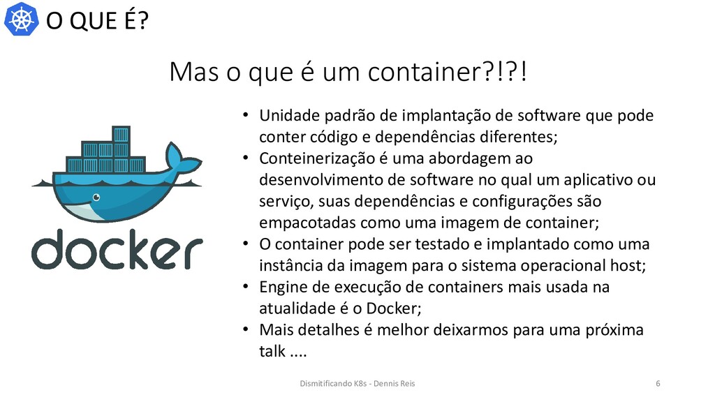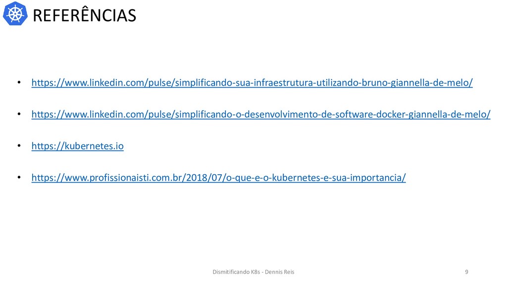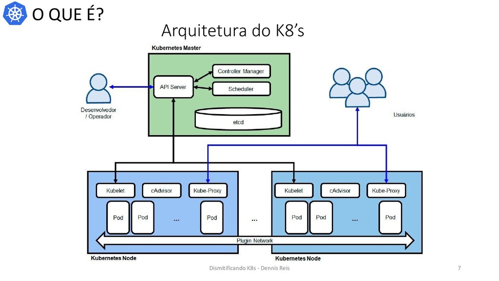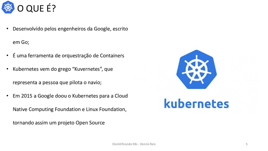 Desenvolvido pelos engenheiros da Google, escrito em Go; • É uma ferramenta de orquestração de Containers • Kubernetes vem do grego “Kuvernetes”, que representa a pessoa que pilota o navio; • Em 2015 a Google doou o Kubernetes para a Cloud Native Computing Foundation e Linux Foundation, tornando assim um projeto Open Source