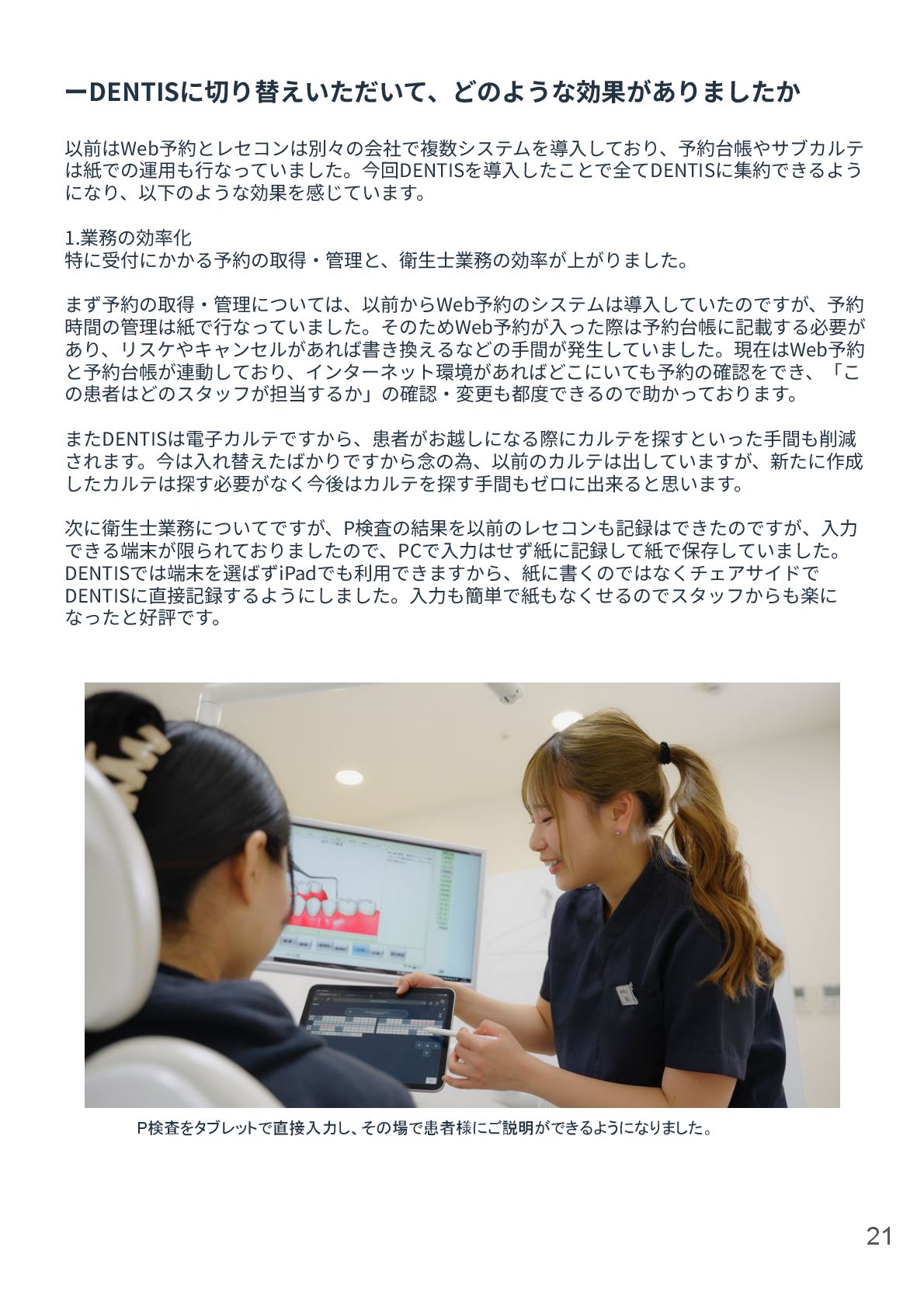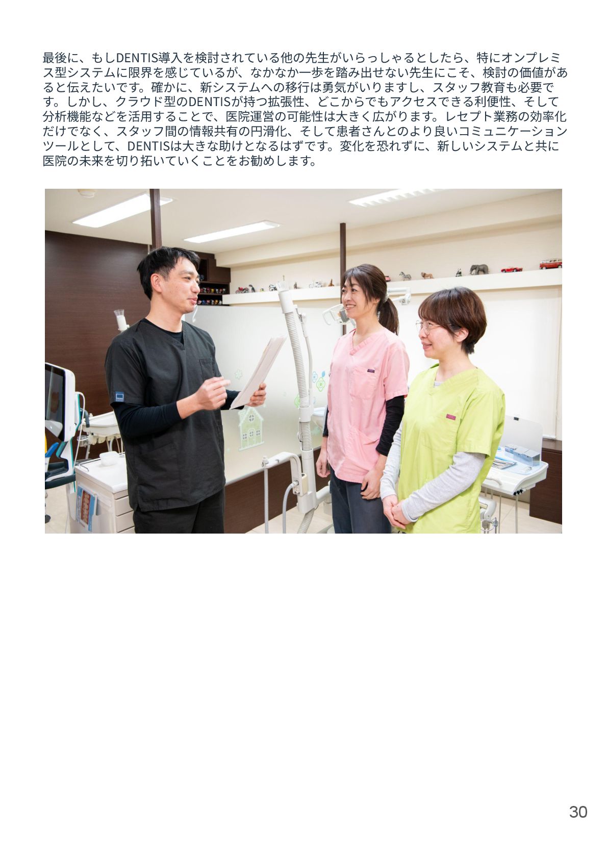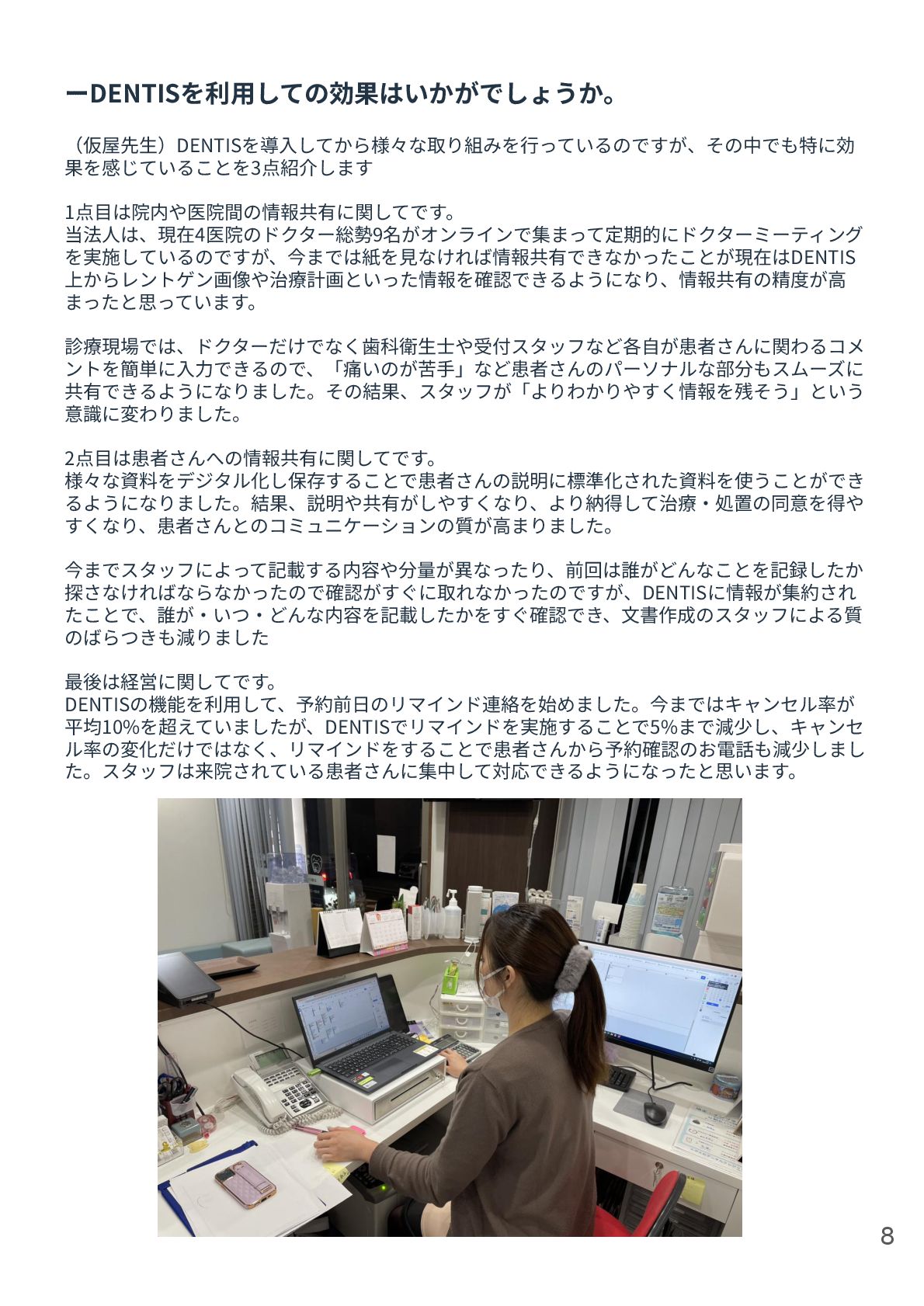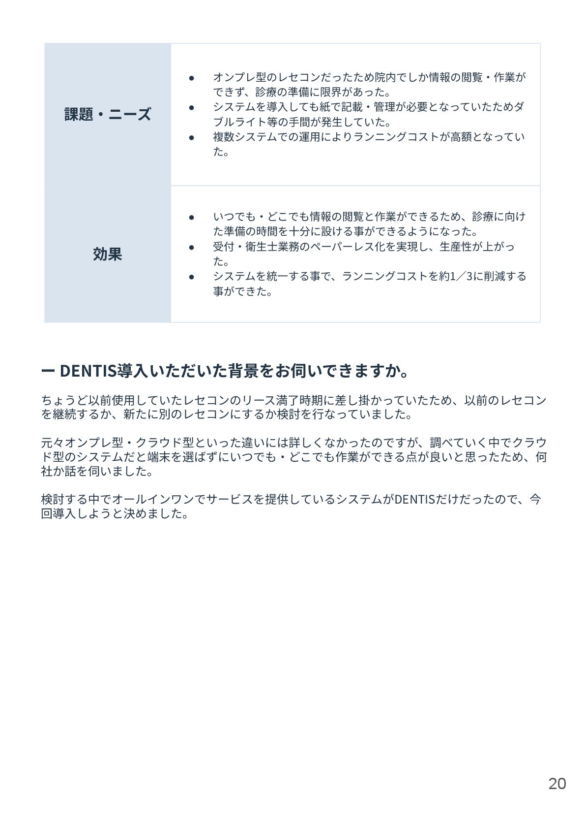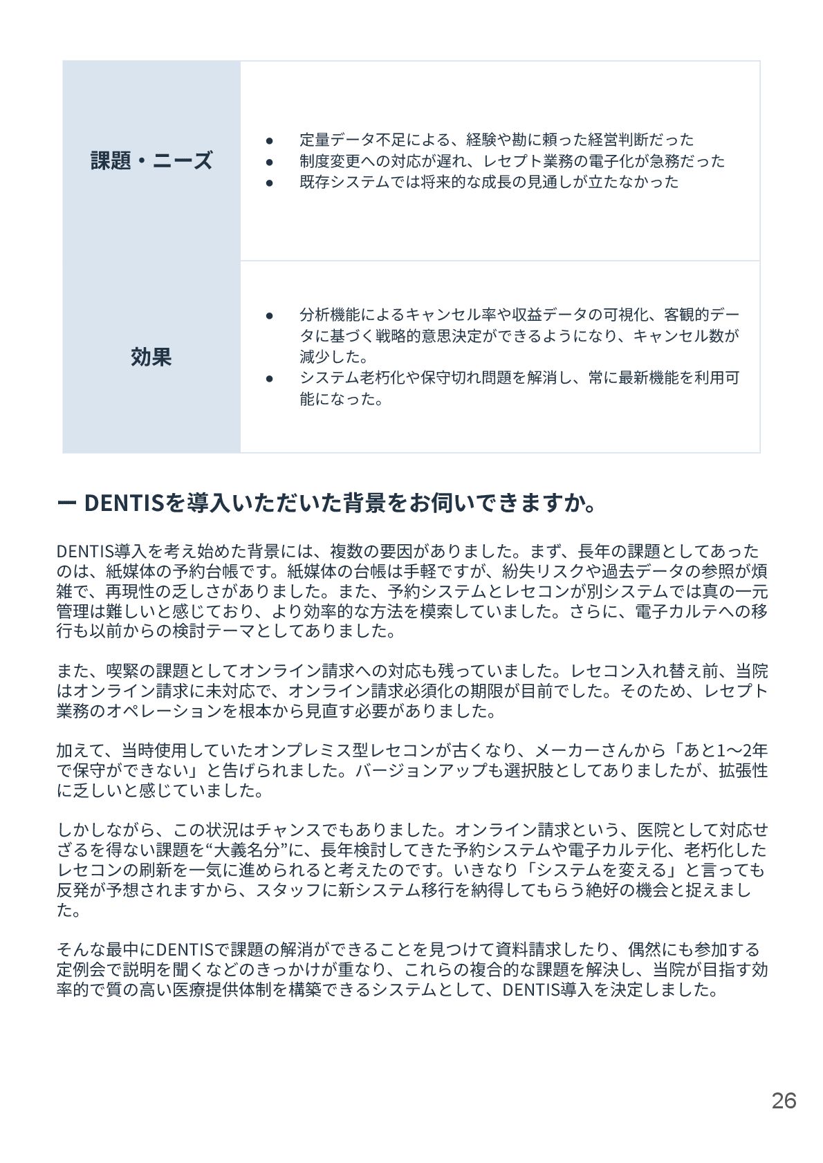 効果 • 分析機能によるキャンセル率や収益データの可視化、客観的デー タに基づく戦略的意思決定ができるようになり、キャンセル数が 減少した。 • システム⽼朽化や保守切れ問題を解消し、常に最新機能を利⽤可 能になった。 ー DENTISを導⼊いただいた背景をお伺いできますか。 DENTIS導⼊を考え始めた背景には、複数の要因がありました。まず、⻑年の課題としてあった のは、紙媒体の予約台帳です。紙媒体の台帳は⼿軽ですが、紛失リスクや過去データの参照が煩 雑で、再現性の乏しさがありました。また、予約システムとレセコンが別システムでは真の⼀元 管理は難しいと感じており、より効率的な⽅法を模索していました。さらに、電⼦カルテへの移 ⾏も以前からの検討テーマとしてありました。 また、喫緊の課題としてオンライン請求への対応も残っていました。レセコン⼊れ替え前、当院 はオンライン請求に未対応で、オンライン請求必須化の期限が⽬前でした。そのため、レセプト 業務のオペレーションを根本から⾒直す必要がありました。 加えて、当時使⽤していたオンプレミス型レセコンが古くなり、メーカーさんから「あと1〜2年 で保守ができない」と告げられました。バージョンアップも選択肢としてありましたが、拡張性 に乏しいと感じていました。 しかしながら、この状況はチャンスでもありました。オンライン請求という、医院として対応せ ざるを得ない課題を“⼤義名分”に、⻑年検討してきた予約システムや電⼦カルテ化、⽼朽化した レセコンの刷新を⼀気に進められると考えたのです。いきなり「システムを変える」と⾔っても 反発が予想されますから、スタッフに新システム移⾏を納得してもらう絶好の機会と捉えまし た。 そんな最中にDENTISで課題の解消ができることを⾒つけて資料請求したり、偶然にも参加する 定例会で説明を聞くなどのきっかけが重なり、これらの複合的な課題を解決し、当院が⽬指す効 率的で質の⾼い医療提供体制を構築できるシステムとして、DENTIS導⼊を決定しました。