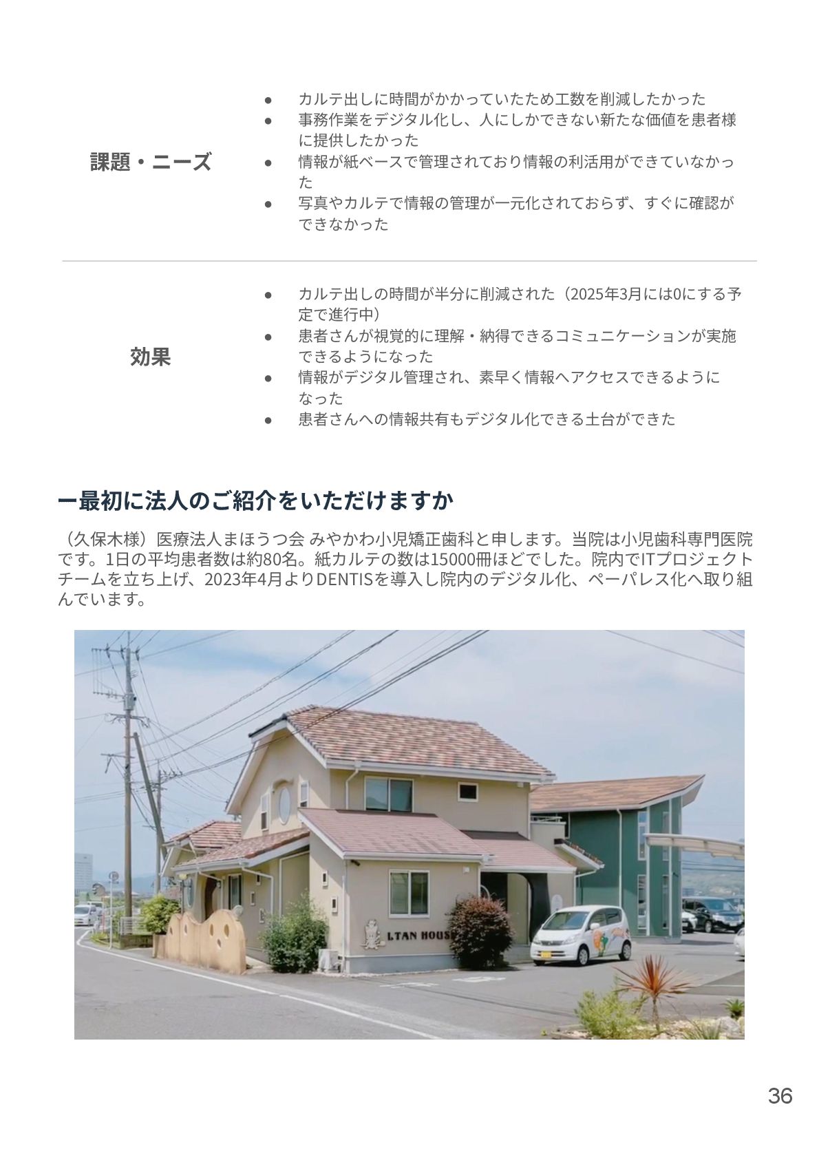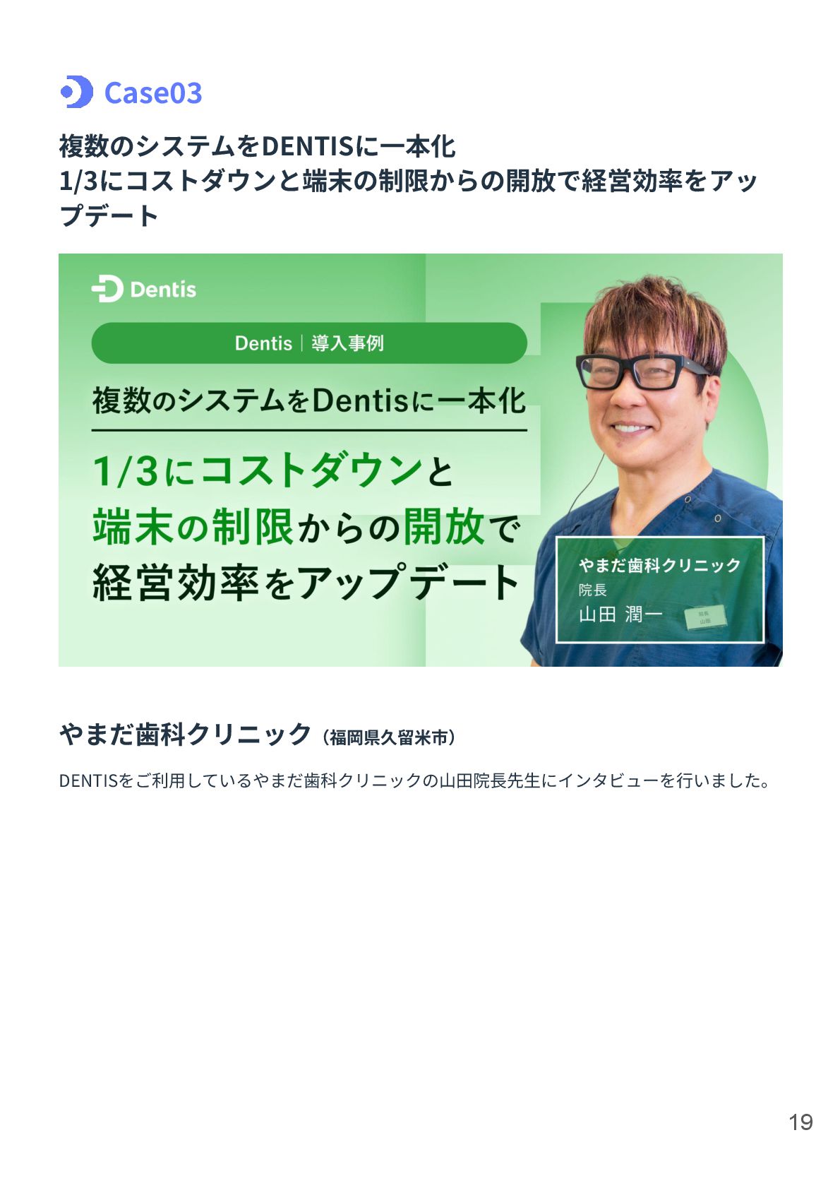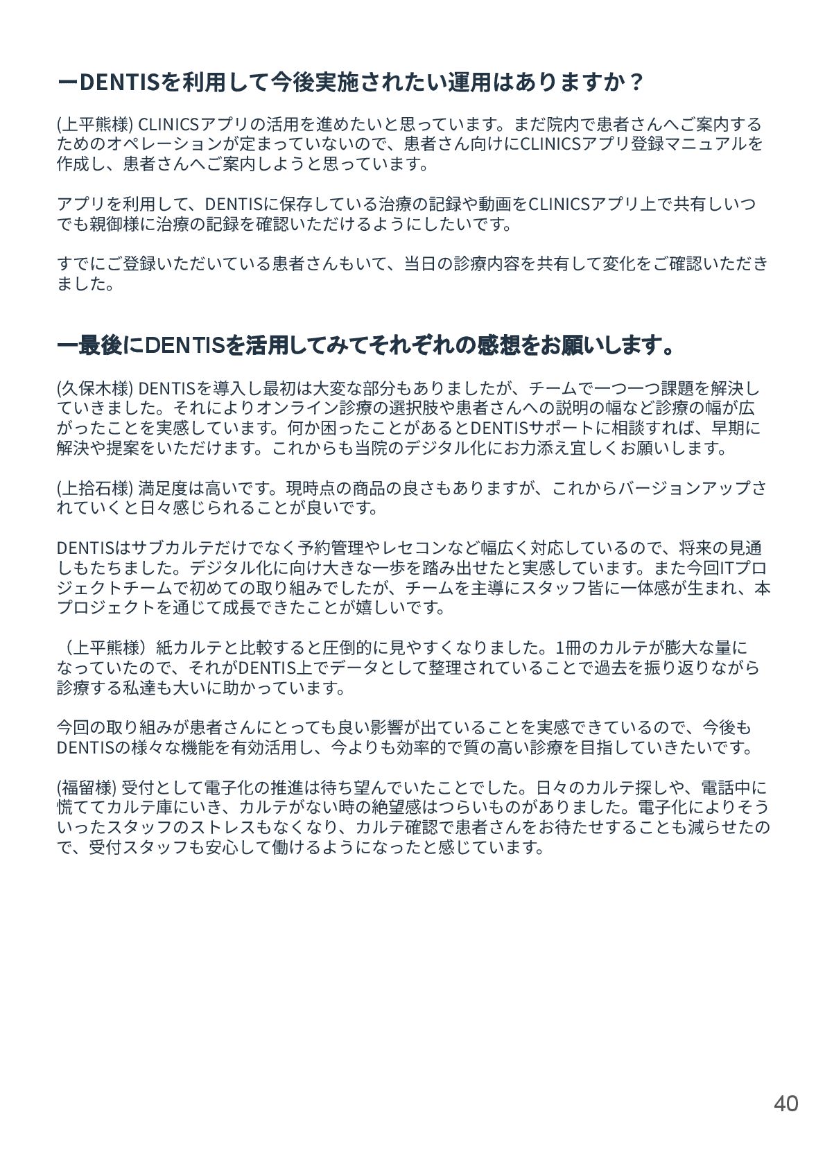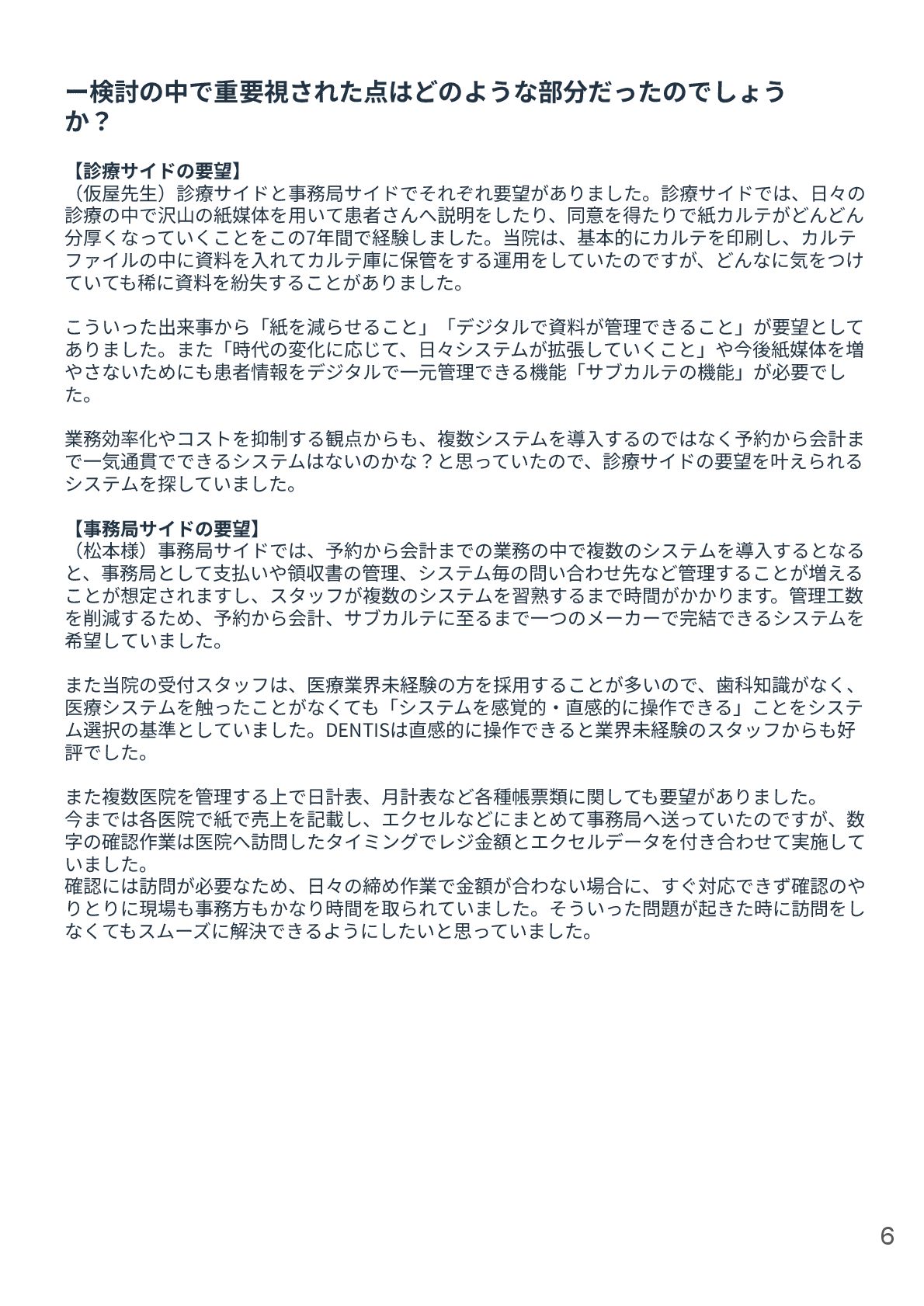 効果 • 分析機能によるキャンセル率や収益データの可視化、客観的デー タに基づく戦略的意思決定ができるようになり、キャンセル数が 減少した。 • システム⽼朽化や保守切れ問題を解消し、常に最新機能を利⽤可 能になった。 ー DENTISを導⼊いただいた背景をお伺いできますか。 DENTIS導⼊を考え始めた背景には、複数の要因がありました。まず、⻑年の課題としてあった のは、紙媒体の予約台帳です。紙媒体の台帳は⼿軽ですが、紛失リスクや過去データの参照が煩 雑で、再現性の乏しさがありました。また、予約システムとレセコンが別システムでは真の⼀元 管理は難しいと感じており、より効率的な⽅法を模索していました。さらに、電⼦カルテへの移 ⾏も以前からの検討テーマとしてありました。 また、喫緊の課題としてオンライン請求への対応も残っていました。レセコン⼊れ替え前、当院 はオンライン請求に未対応で、オンライン請求必須化の期限が⽬前でした。そのため、レセプト 業務のオペレーションを根本から⾒直す必要がありました。 加えて、当時使⽤していたオンプレミス型レセコンが古くなり、メーカーさんから「あと1〜2年 で保守ができない」と告げられました。バージョンアップも選択肢としてありましたが、拡張性 に乏しいと感じていました。 しかしながら、この状況はチャンスでもありました。オンライン請求という、医院として対応せ ざるを得ない課題を“⼤義名分”に、⻑年検討してきた予約システムや電⼦カルテ化、⽼朽化した レセコンの刷新を⼀気に進められると考えたのです。いきなり「システムを変える」と⾔っても 反発が予想されますから、スタッフに新システム移⾏を納得してもらう絶好の機会と捉えまし た。 そんな最中にDENTISで課題の解消ができることを⾒つけて資料請求したり、偶然にも参加する 定例会で説明を聞くなどのきっかけが重なり、これらの複合的な課題を解決し、当院が⽬指す効 率的で質の⾼い医療提供体制を構築できるシステムとして、DENTIS導⼊を決定しました。
