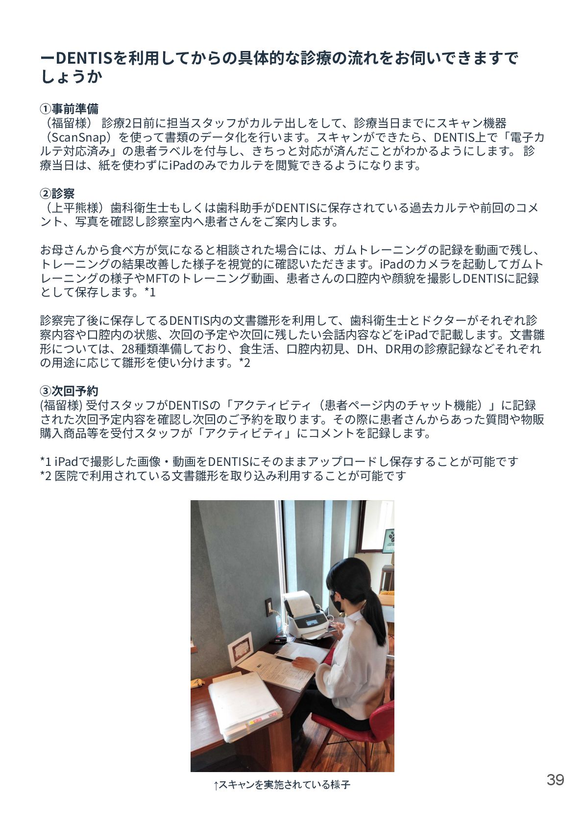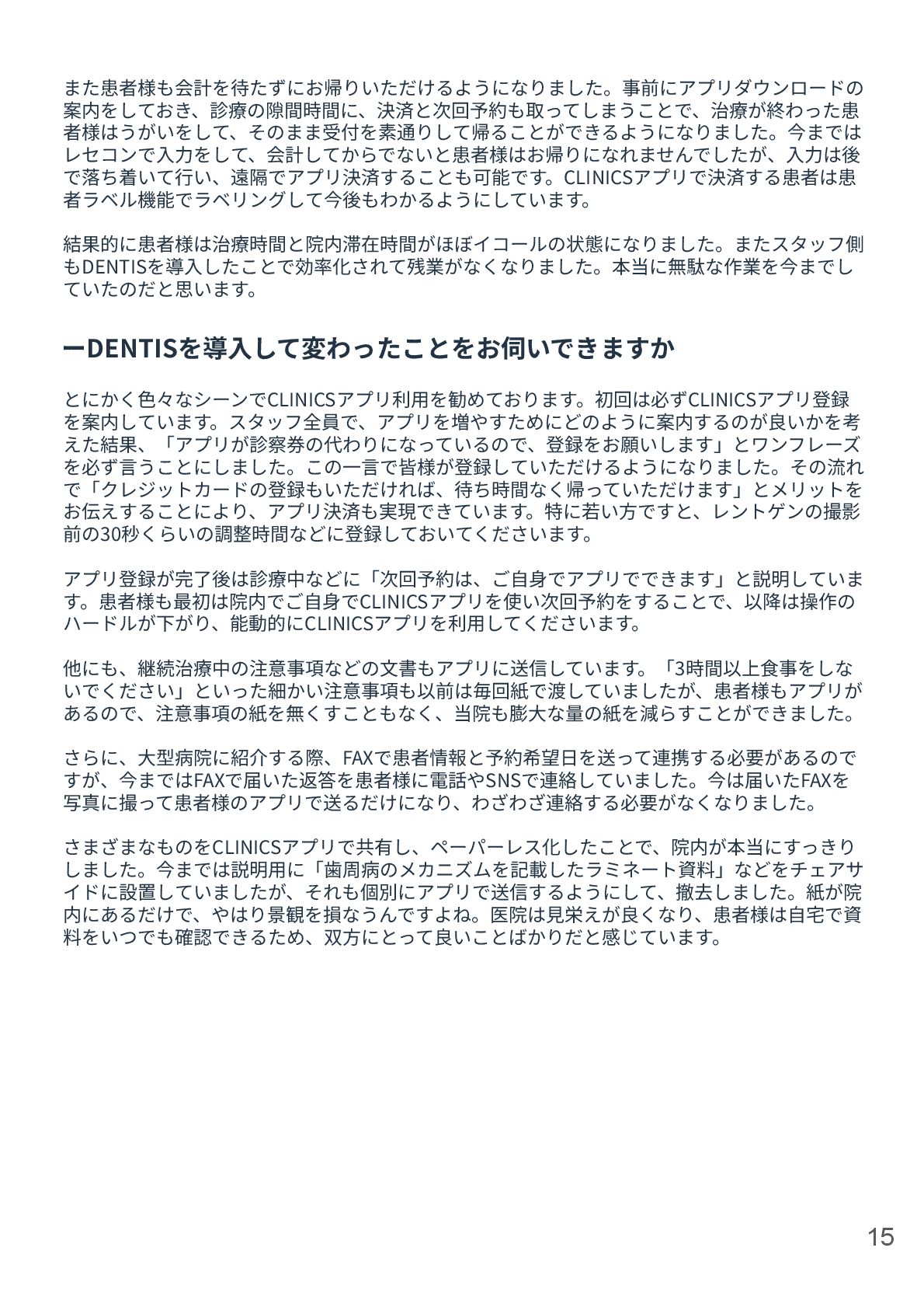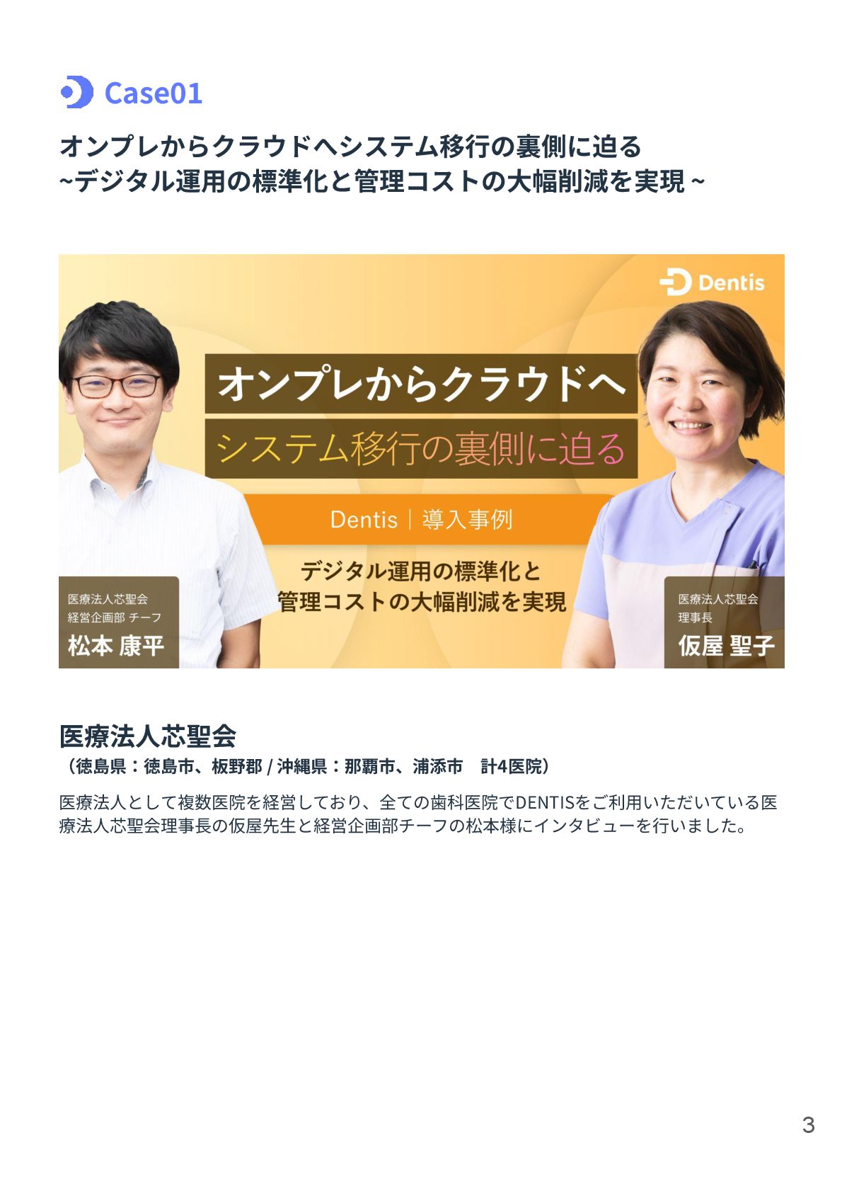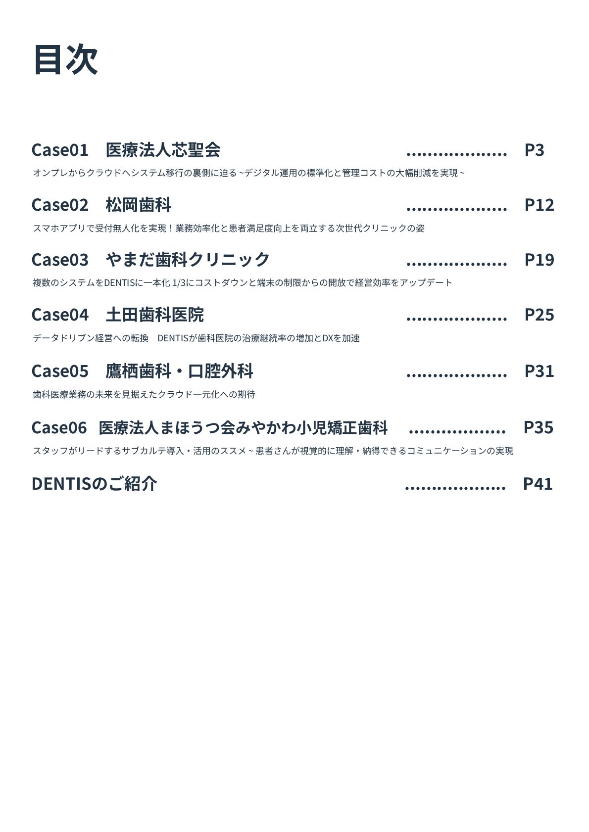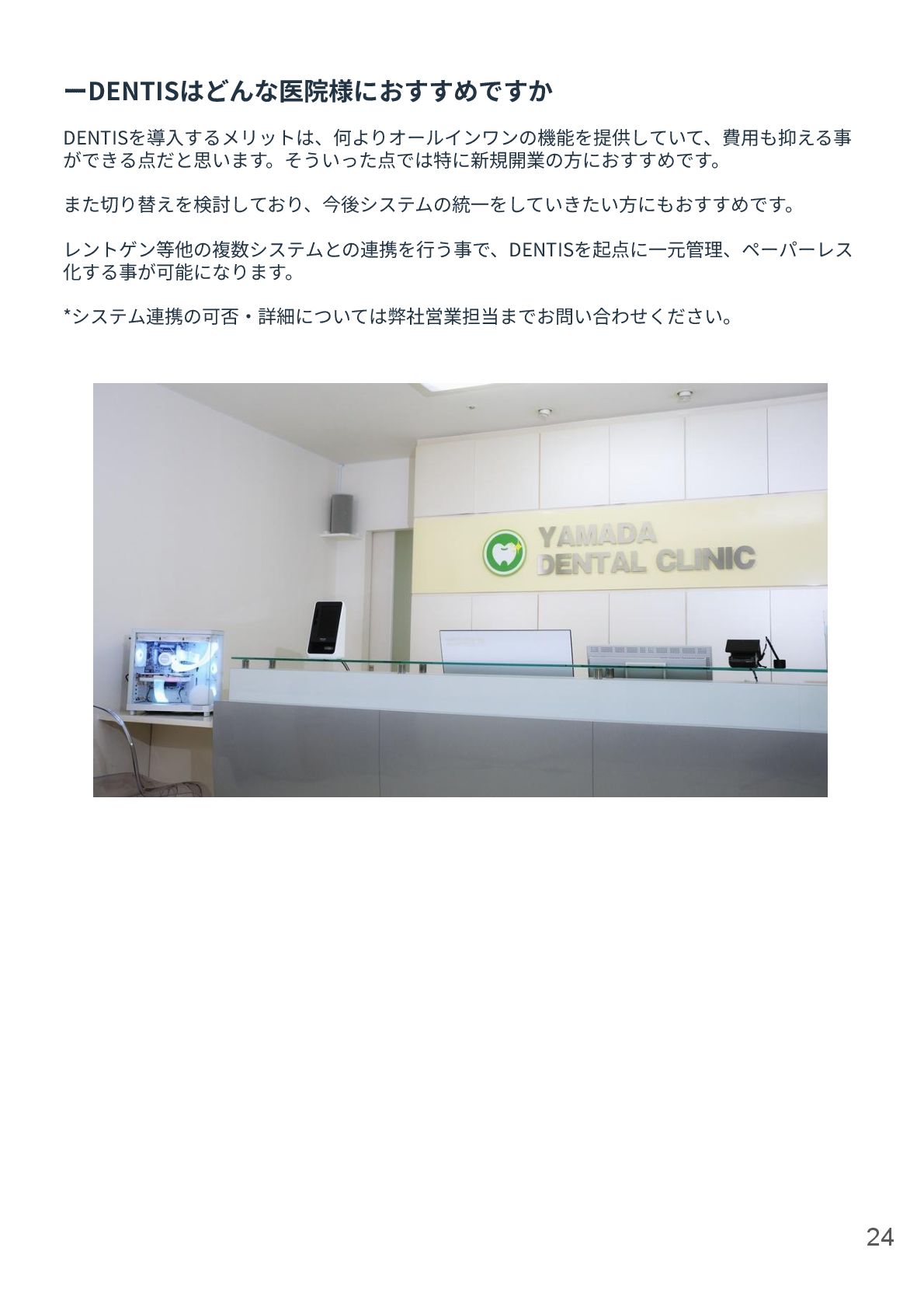 効果 • 分析機能によるキャンセル率や収益データの可視化、客観的デー タに基づく戦略的意思決定ができるようになり、キャンセル数が 減少した。 • システム⽼朽化や保守切れ問題を解消し、常に最新機能を利⽤可 能になった。 ー DENTISを導⼊いただいた背景をお伺いできますか。 DENTIS導⼊を考え始めた背景には、複数の要因がありました。まず、⻑年の課題としてあった のは、紙媒体の予約台帳です。紙媒体の台帳は⼿軽ですが、紛失リスクや過去データの参照が煩 雑で、再現性の乏しさがありました。また、予約システムとレセコンが別システムでは真の⼀元 管理は難しいと感じており、より効率的な⽅法を模索していました。さらに、電⼦カルテへの移 ⾏も以前からの検討テーマとしてありました。 また、喫緊の課題としてオンライン請求への対応も残っていました。レセコン⼊れ替え前、当院 はオンライン請求に未対応で、オンライン請求必須化の期限が⽬前でした。そのため、レセプト 業務のオペレーションを根本から⾒直す必要がありました。 加えて、当時使⽤していたオンプレミス型レセコンが古くなり、メーカーさんから「あと1〜2年 で保守ができない」と告げられました。バージョンアップも選択肢としてありましたが、拡張性 に乏しいと感じていました。 しかしながら、この状況はチャンスでもありました。オンライン請求という、医院として対応せ ざるを得ない課題を“⼤義名分”に、⻑年検討してきた予約システムや電⼦カルテ化、⽼朽化した レセコンの刷新を⼀気に進められると考えたのです。いきなり「システムを変える」と⾔っても 反発が予想されますから、スタッフに新システム移⾏を納得してもらう絶好の機会と捉えまし た。 そんな最中にDENTISで課題の解消ができることを⾒つけて資料請求したり、偶然にも参加する 定例会で説明を聞くなどのきっかけが重なり、これらの複合的な課題を解決し、当院が⽬指す効 率的で質の⾼い医療提供体制を構築できるシステムとして、DENTIS導⼊を決定しました。