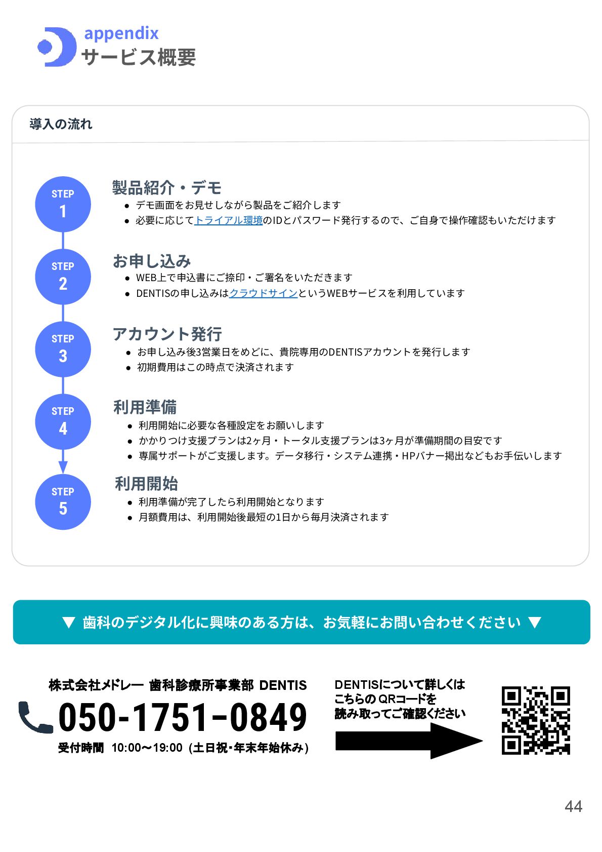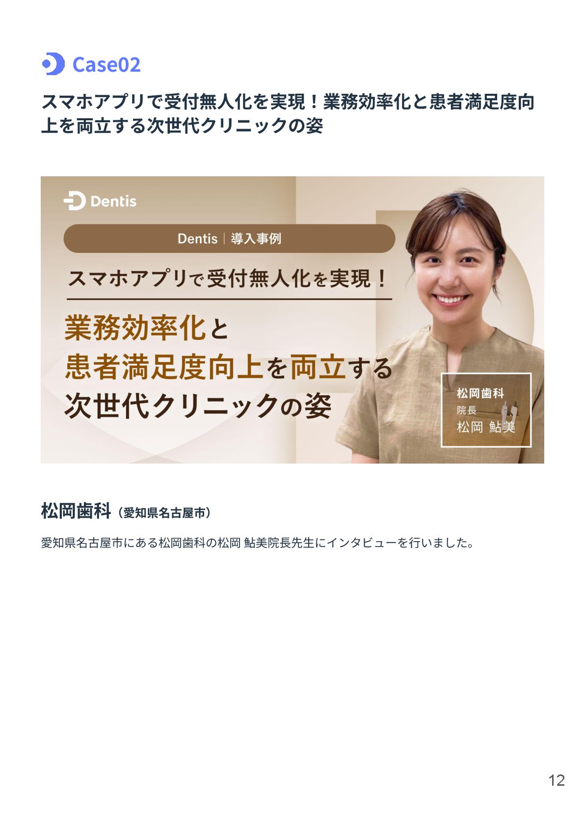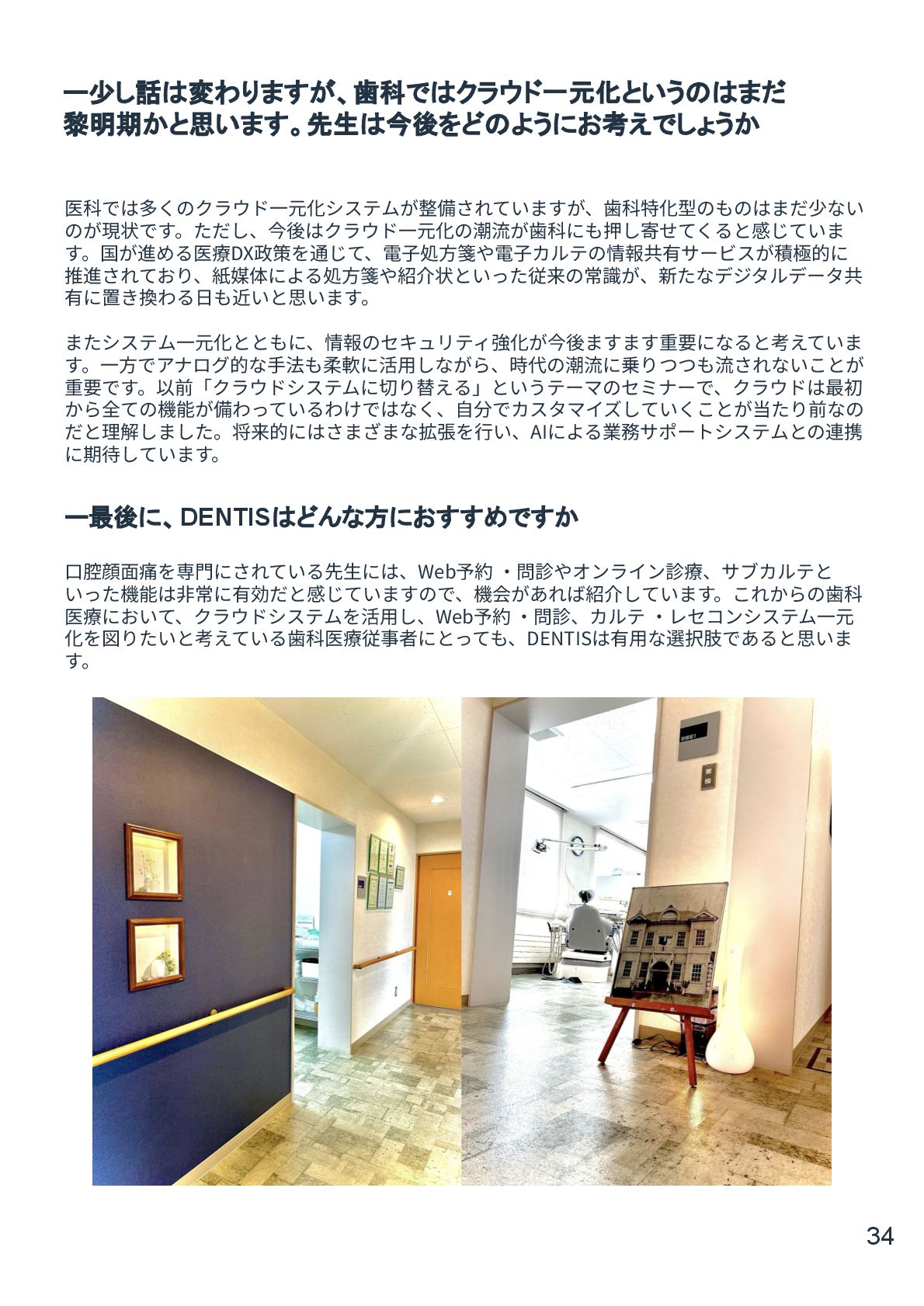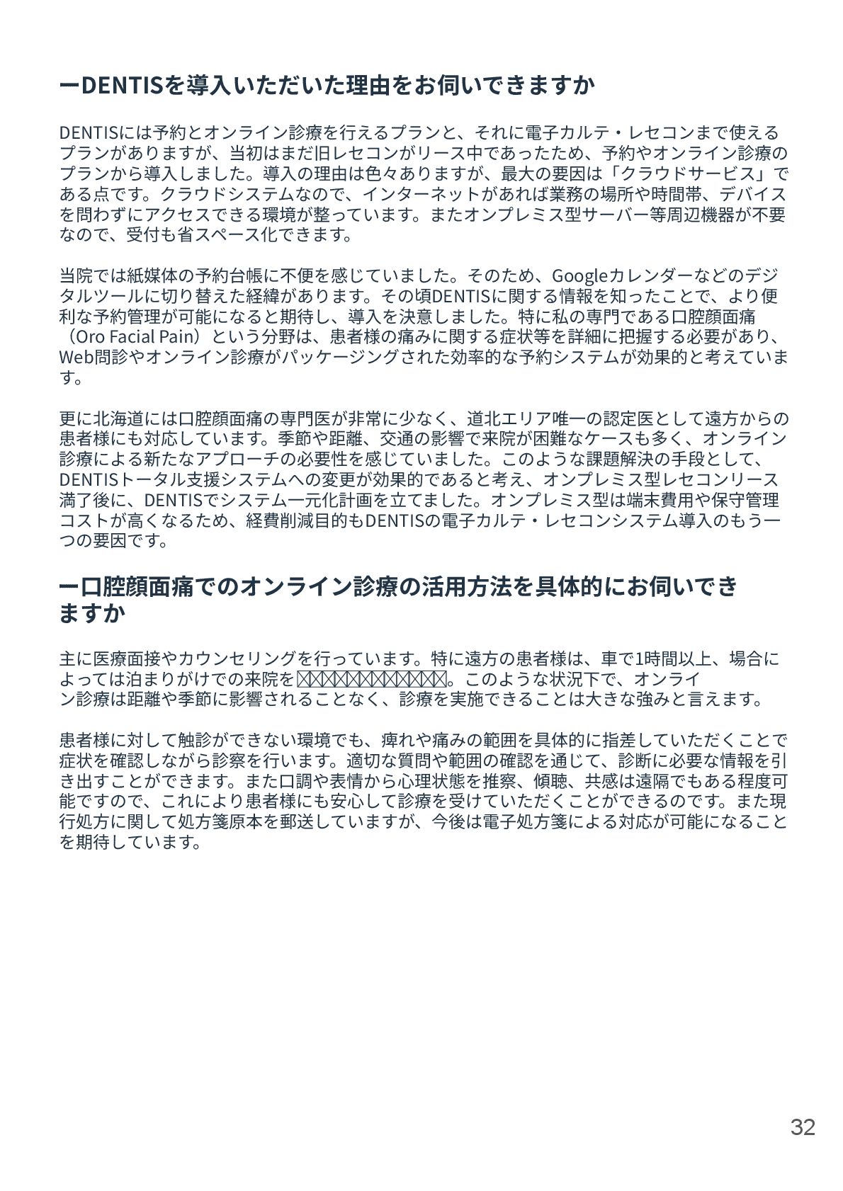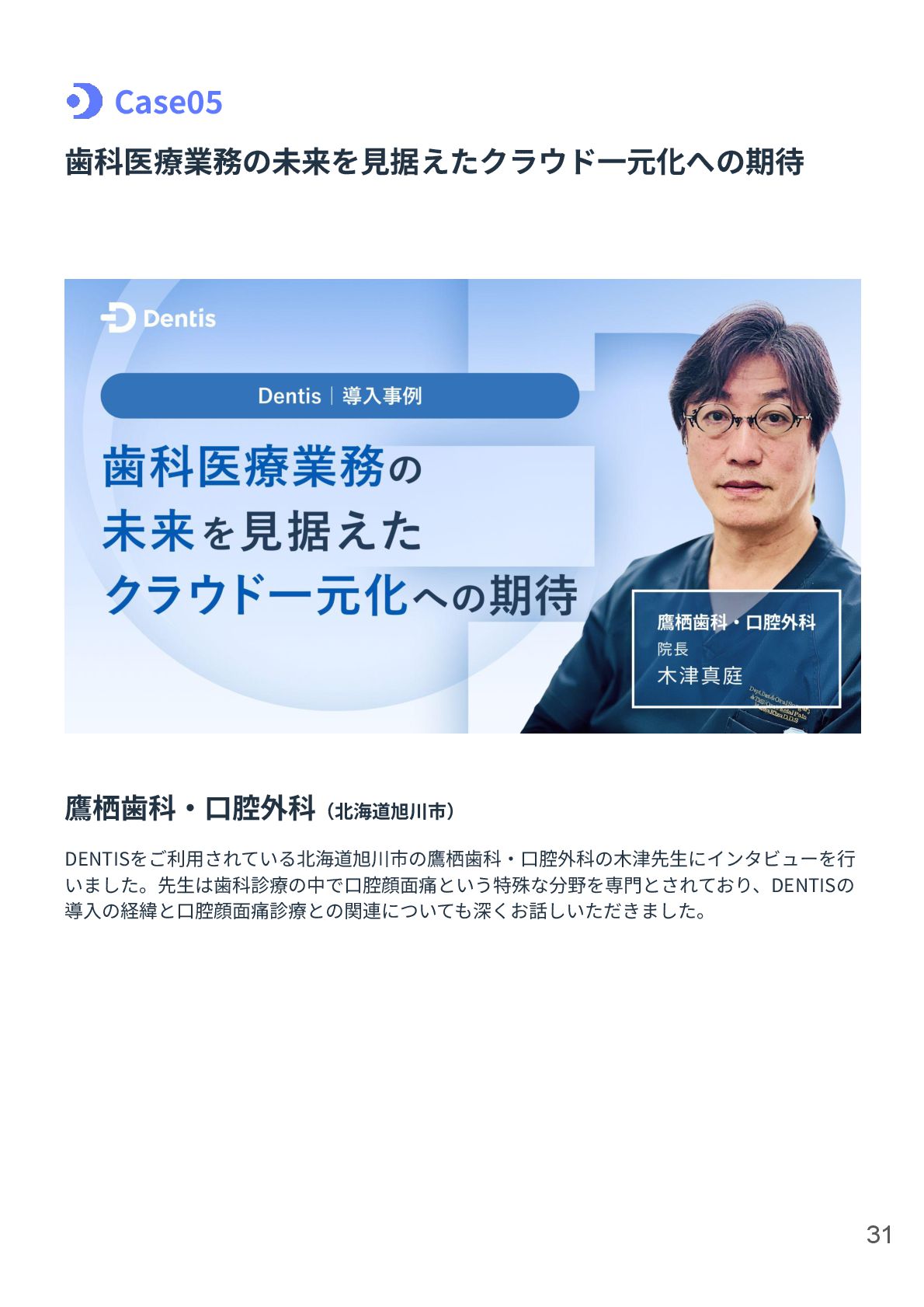 効果 • 分析機能によるキャンセル率や収益データの可視化、客観的デー タに基づく戦略的意思決定ができるようになり、キャンセル数が 減少した。 • システム⽼朽化や保守切れ問題を解消し、常に最新機能を利⽤可 能になった。 ー DENTISを導⼊いただいた背景をお伺いできますか。 DENTIS導⼊を考え始めた背景には、複数の要因がありました。まず、⻑年の課題としてあった のは、紙媒体の予約台帳です。紙媒体の台帳は⼿軽ですが、紛失リスクや過去データの参照が煩 雑で、再現性の乏しさがありました。また、予約システムとレセコンが別システムでは真の⼀元 管理は難しいと感じており、より効率的な⽅法を模索していました。さらに、電⼦カルテへの移 ⾏も以前からの検討テーマとしてありました。 また、喫緊の課題としてオンライン請求への対応も残っていました。レセコン⼊れ替え前、当院 はオンライン請求に未対応で、オンライン請求必須化の期限が⽬前でした。そのため、レセプト 業務のオペレーションを根本から⾒直す必要がありました。 加えて、当時使⽤していたオンプレミス型レセコンが古くなり、メーカーさんから「あと1〜2年 で保守ができない」と告げられました。バージョンアップも選択肢としてありましたが、拡張性 に乏しいと感じていました。 しかしながら、この状況はチャンスでもありました。オンライン請求という、医院として対応せ ざるを得ない課題を“⼤義名分”に、⻑年検討してきた予約システムや電⼦カルテ化、⽼朽化した レセコンの刷新を⼀気に進められると考えたのです。いきなり「システムを変える」と⾔っても 反発が予想されますから、スタッフに新システム移⾏を納得してもらう絶好の機会と捉えまし た。 そんな最中にDENTISで課題の解消ができることを⾒つけて資料請求したり、偶然にも参加する 定例会で説明を聞くなどのきっかけが重なり、これらの複合的な課題を解決し、当院が⽬指す効 率的で質の⾼い医療提供体制を構築できるシステムとして、DENTIS導⼊を決定しました。
