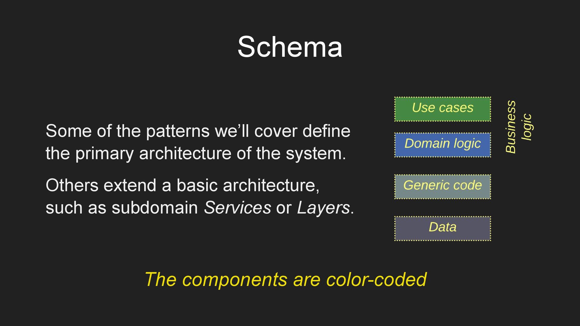 of the system. Others extend a basic architecture, such as subdomain Services or Layers. The components are color-coded Schema
