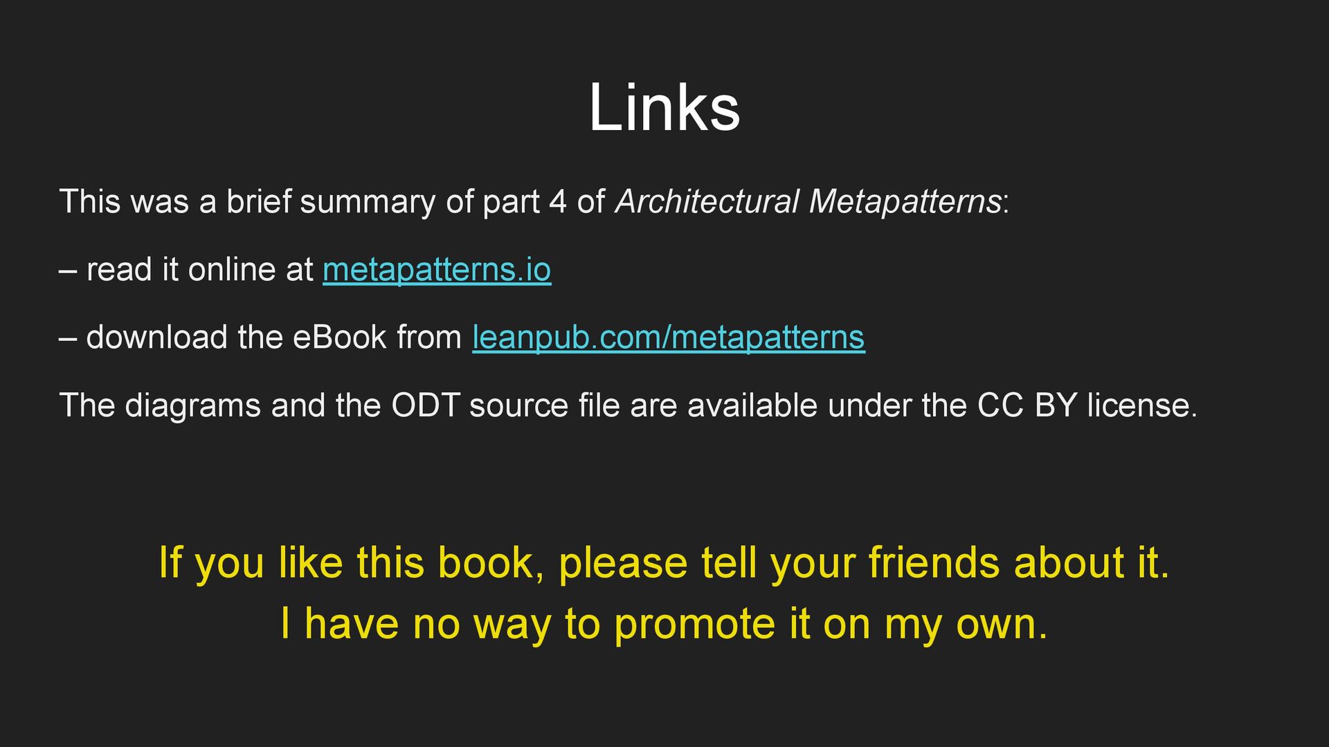 Architectural Metapatterns: – read it online at metapatterns.io – download the eBook from leanpub.com/metapatterns The diagrams and the ODT source file are available under the CC BY license. If you like this book, please tell your friends about it. I have no way to promote it on my own.