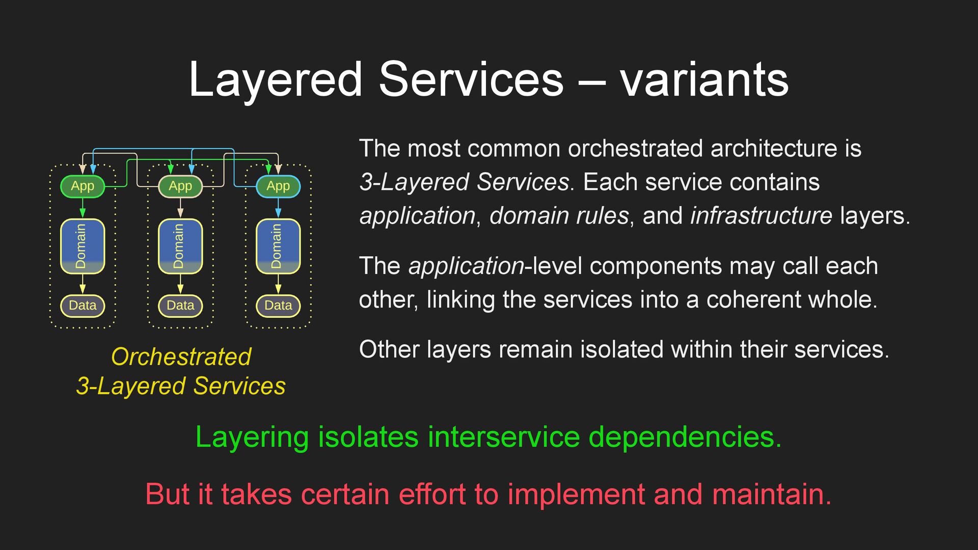 3-Layered Services. Each service contains application, domain rules, and infrastructure layers. The application-level components may call each other, linking the services into a coherent whole. Other layers remain isolated within their services. Layering isolates interservice dependencies. But it takes certain effort to implement and maintain. Orchestrated 3-Layered Services