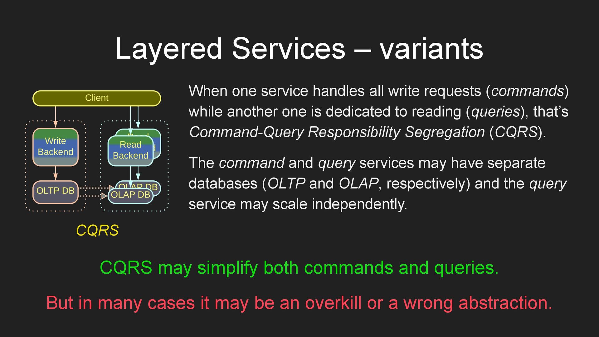 requests (commands) while another one is dedicated to reading (queries), that’s Command-Query Responsibility Segregation (CQRS). The command and query services may have separate databases (OLTP and OLAP, respectively) and the query service may scale independently. CQRS may simplify both commands and queries. But in many cases it may be an overkill or a wrong abstraction. CQRS
