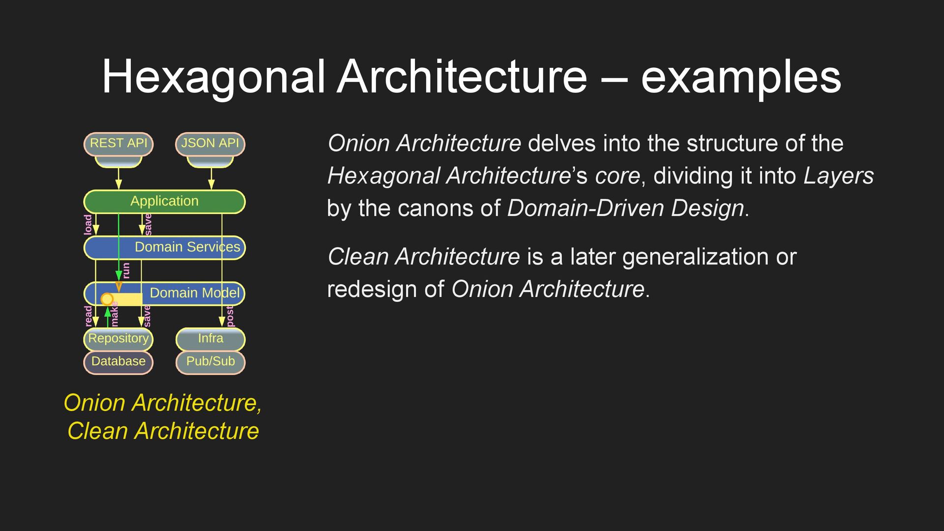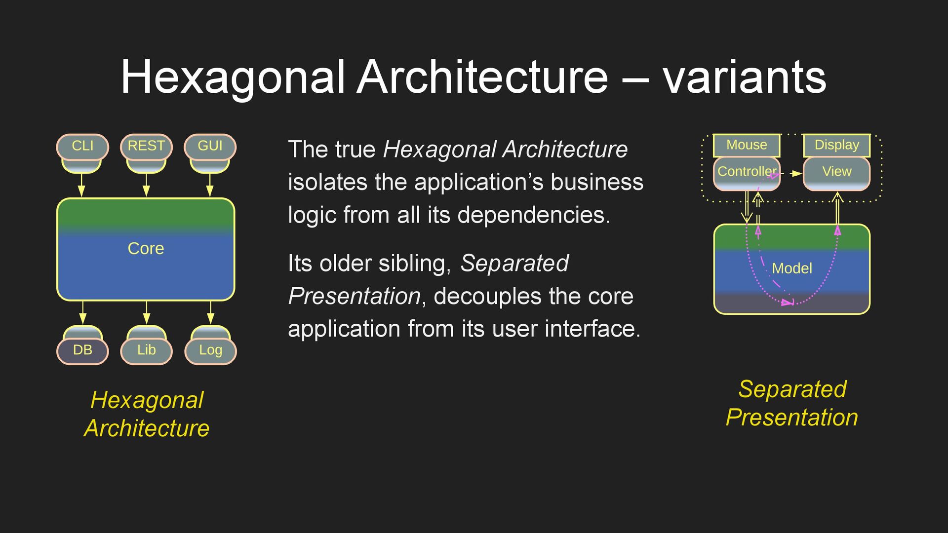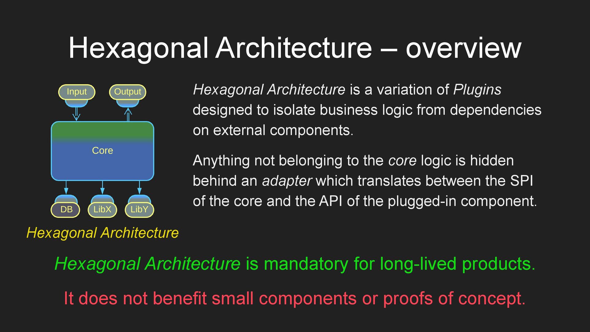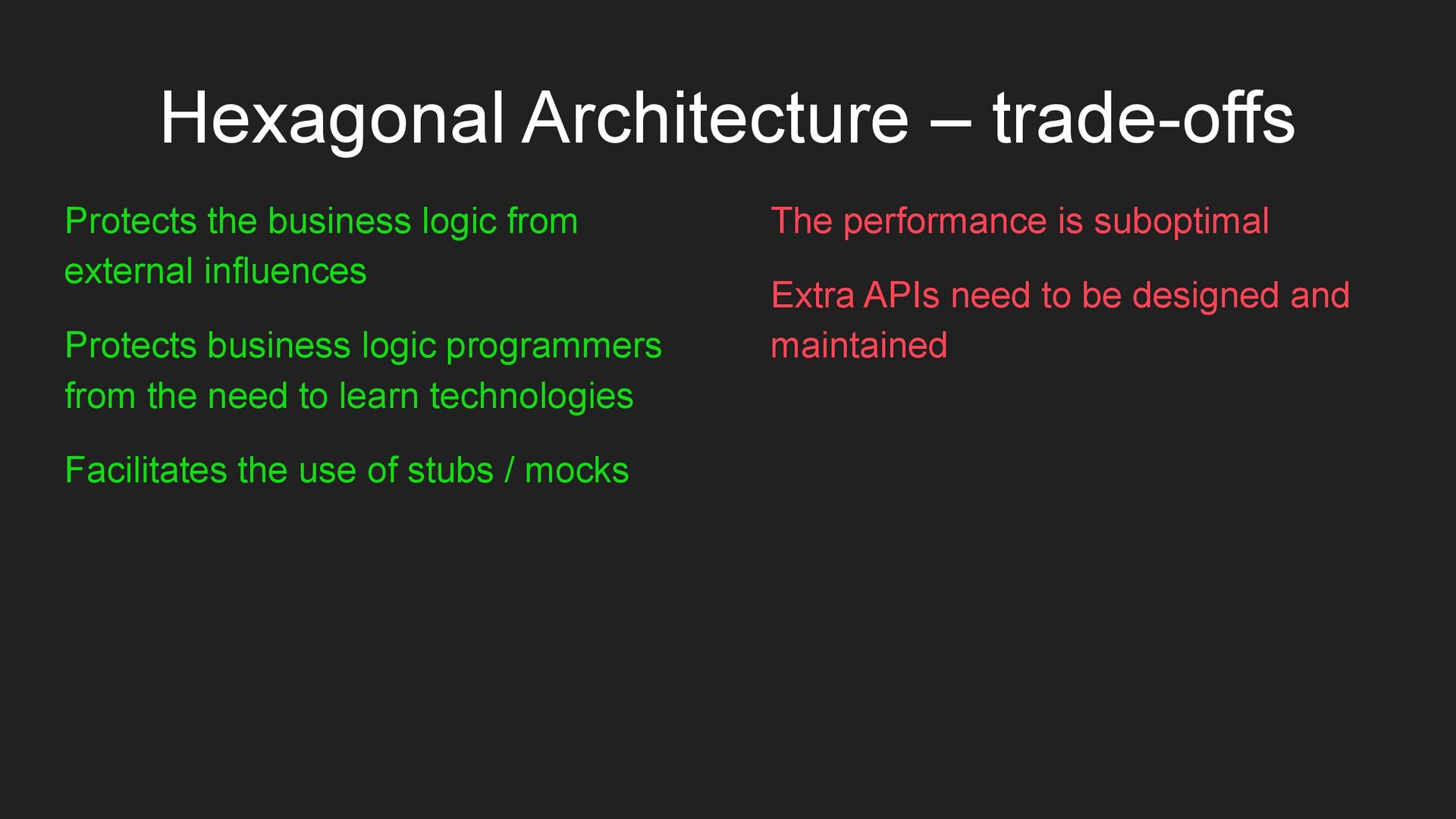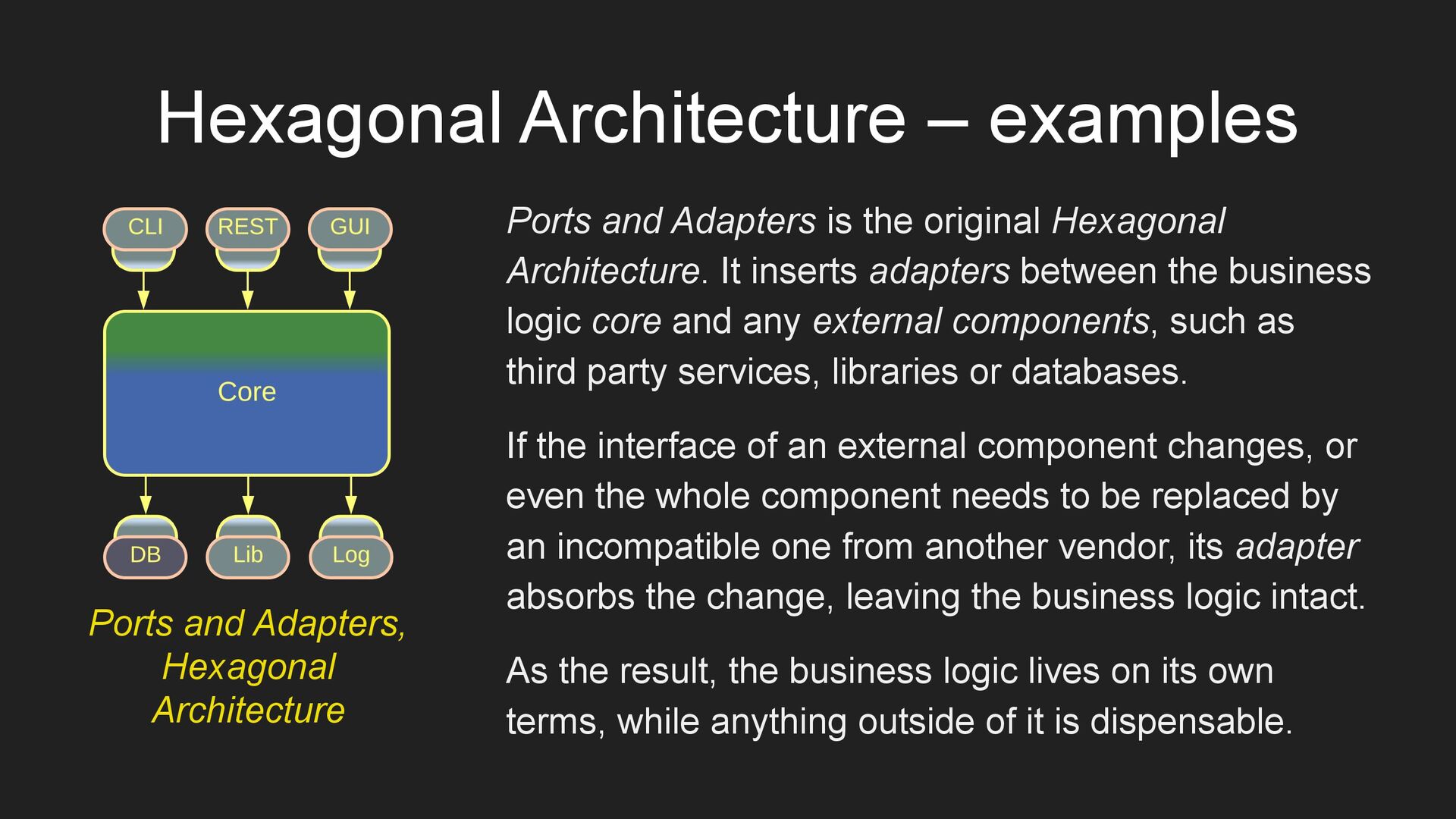 * Hexagonal Architecture isolates the business logic from external dependencies.