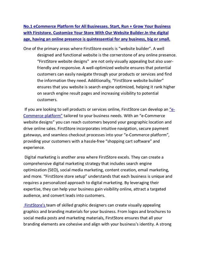 "FirstStore.io is the simple, user-friendly ecommerce platform that helps small businesses succeed. With our all-in-one solution, you can set up your store, manage your inventory, accept payments, and track your sales in minutes. Plus, our expert support team is always available to help you along the way. Start growing your business with FirstStore.io today!"https//:FirstStore.io