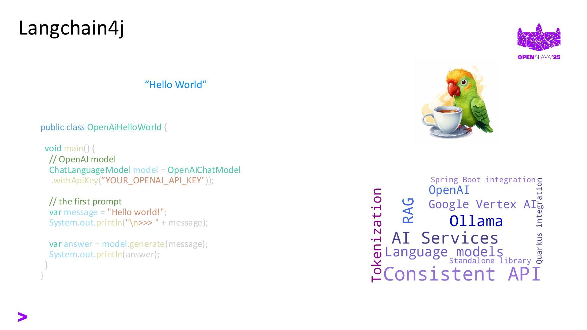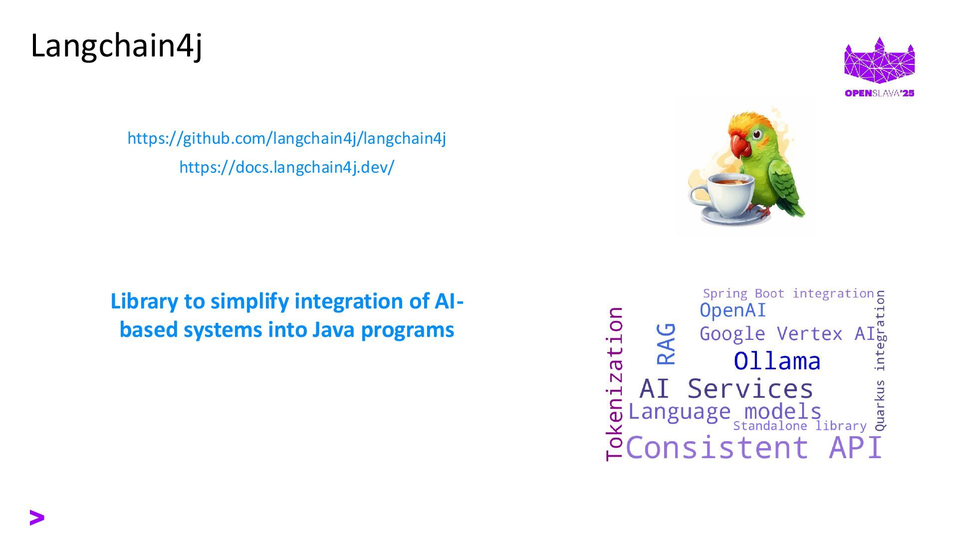 Slides from my workshop at OpenSlava 2025 (October 15th) titled "Langchain4j & Ollama - Integrating LLMs with Java programs".