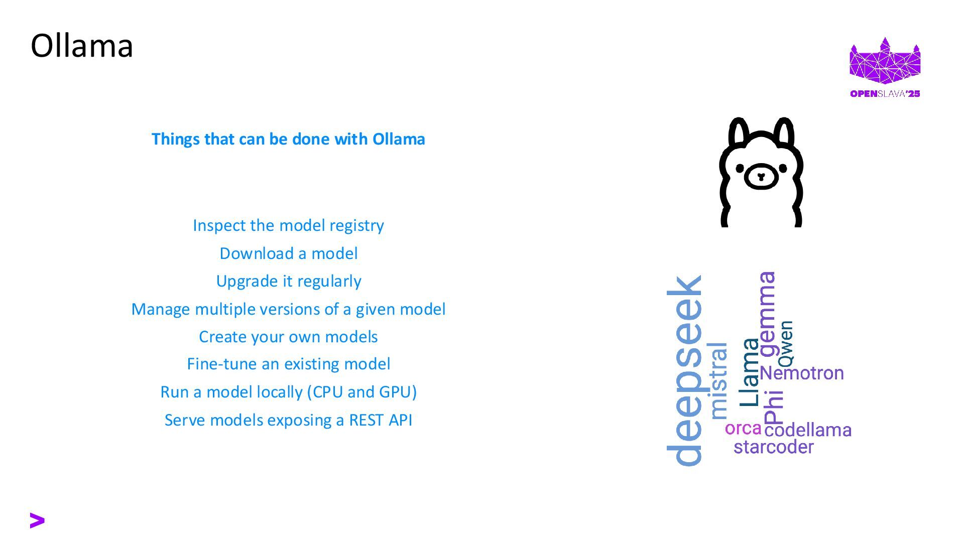 regularly Manage multiple versions of a given model Create your own models Fine-tune an existing model Run a model locally (CPU and GPU) Serve models exposing a REST API Things that can be done with Ollama