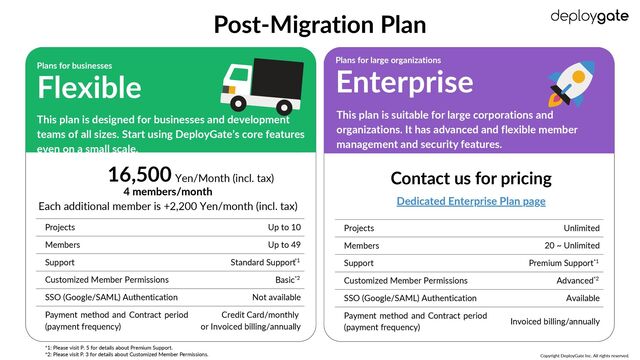 teams of all sizes. Start using DeployGate’s core features even on a small scale. Plans for businesses Flexible This plan is suitable for large corporations and organizations. It has advanced and flexible member management and security features. Plans for large organizations Enterprise Projects Members Support Customized Member Permissions SSO (Google/SAML) Authentication 16,500 Yen/Month (incl. tax) 4 members/month Each additional member is +2,200 Yen/month (incl. tax) Up to 10 Up to 49 Standard Support Basic Not available Credit Card/monthly or Invoiced billing/annually Projects Members Support Customized Member Permissions SSO (Google/SAML) Authentication Payment method and Contract period (payment frequency) Contact us for pricing Unlimited 20 ~ Unlimited Premium Support Advanced Available Invoiced billing/annually Dedicated Enterprise Plan page Copyright DeployGate Inc. All rights reserved. *2 *2 *1 *1 *1: Please visit P. 5 for details about Premium Support. *2: Please visit P. 3 for details about Customized Member Permissions. Payment method and Contract period (payment frequency)