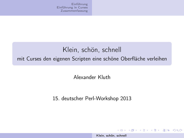 Gliederung 1 Einführung Wieso eigentlich? Motivation! Warum Curses? 2 Einführung in Curses Kurze Geschichte zum Aufbau Was Curses::UI ausmacht: Die Widgets, Teil 1 Was Curses::UI ausmacht - Die Widgets, Teil 2 Bindings und Dialoge Klein, schön, schnell