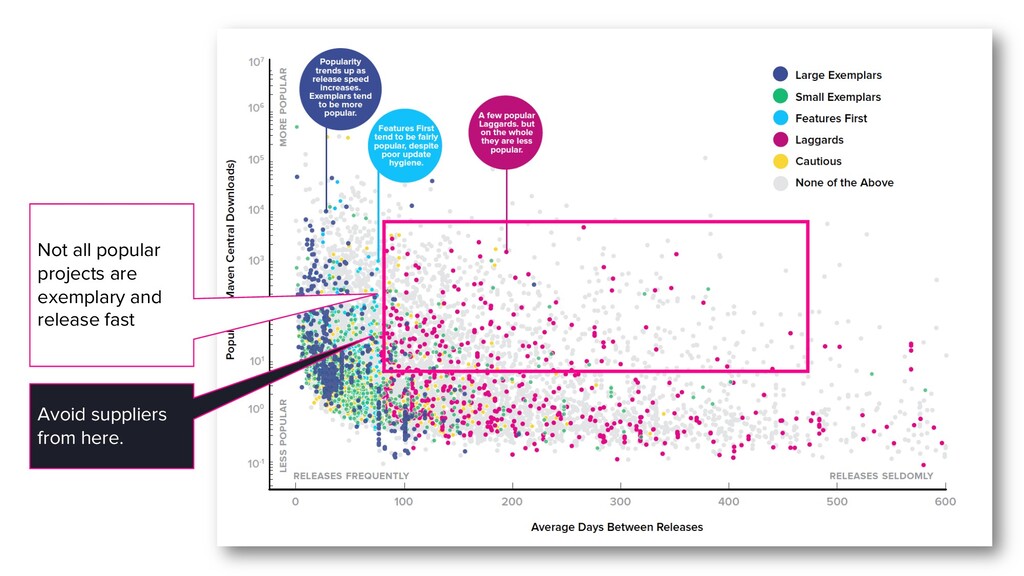 Team Avg. unique monthly contributors Development Speed Avg. commits per month Release Speed Avg. period between releases Presence of CI Presence of popular cloud CI systems Foundation Support Associated with an open source foundation Security More complicated Update Speed More complicated @weekstweets What we observed across 24,000 OSS projects