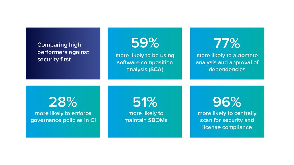 28% more likely to be using software composition analysis (SCA) more likely to automate analysis and approval of dependencies more likely to maintain SBOMs more likely to centrally scan for security and license compliance more likely to enforce governance policies in CI Comparing high performers against security first