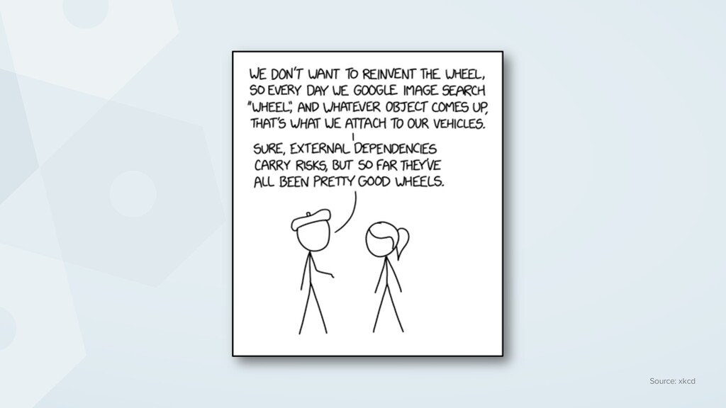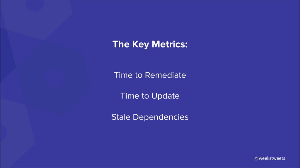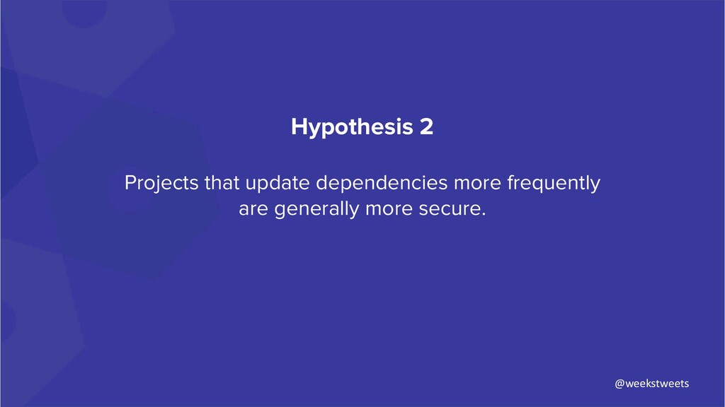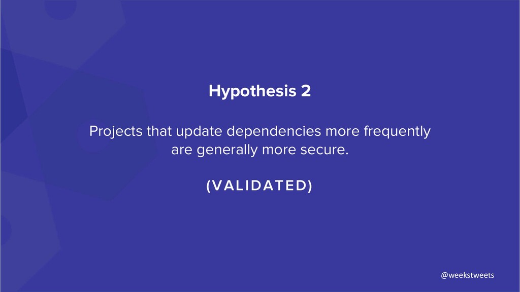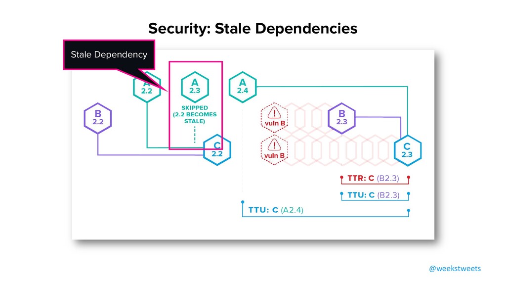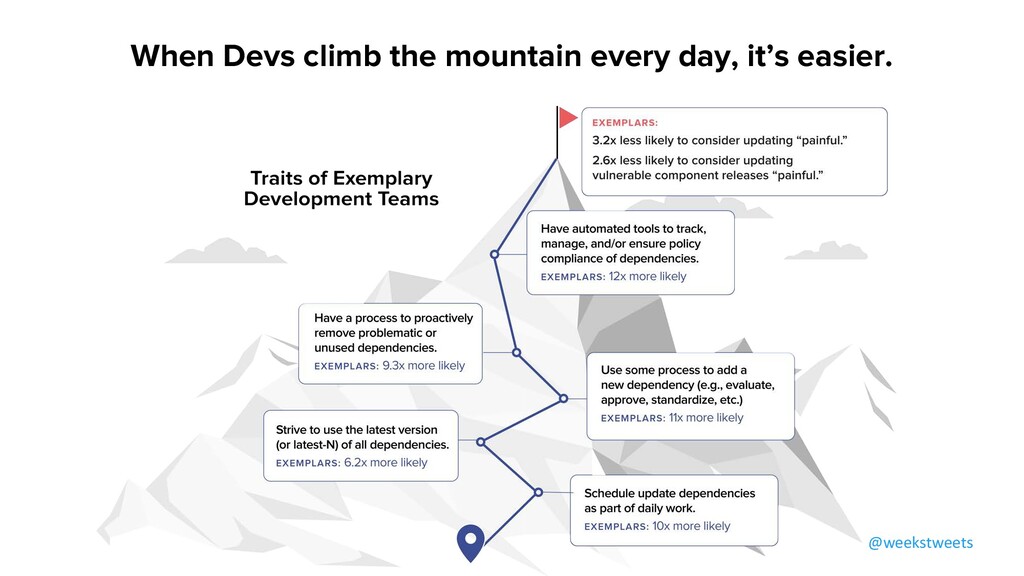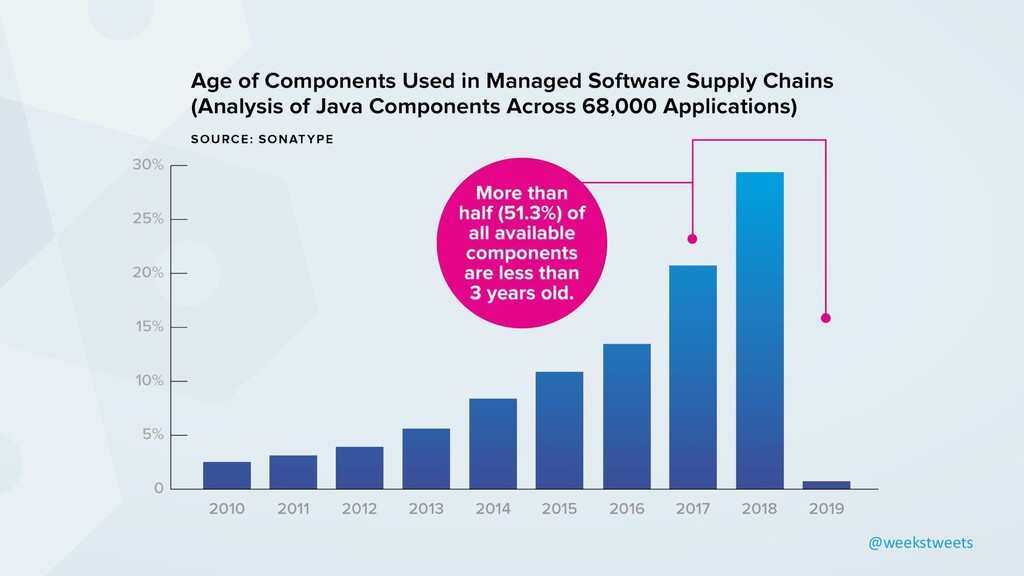 We strive to use the latest version (or latest-N) of all our dependencies We use some process to add a new dependency (e.g., evaluate, approve, standardize, etc.) We have a process to proactively remove problematic or unused dependencies We have automated tools to track, manage, and/or ensure policy compliance of our dependencies 46% YES 50% YES 30% YES 37% YES Enterprise Devs Manage Dependencies @weekstweets n = 658 38% YES