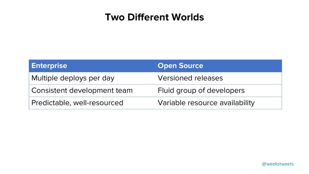 Versioned releases Consistent development team Fluid group of developers Predictable, well-resourced Variable resource availability @weekstweets