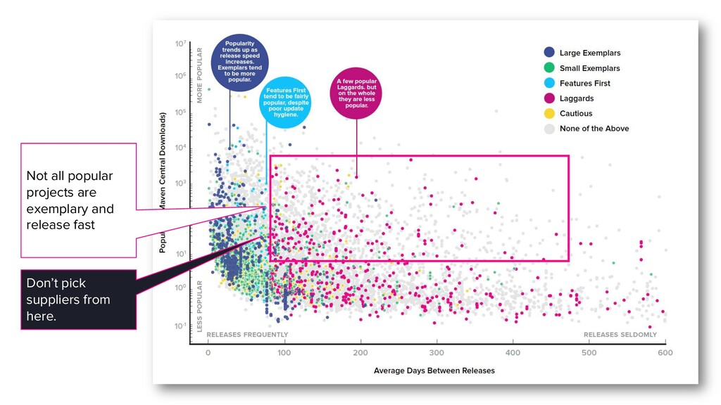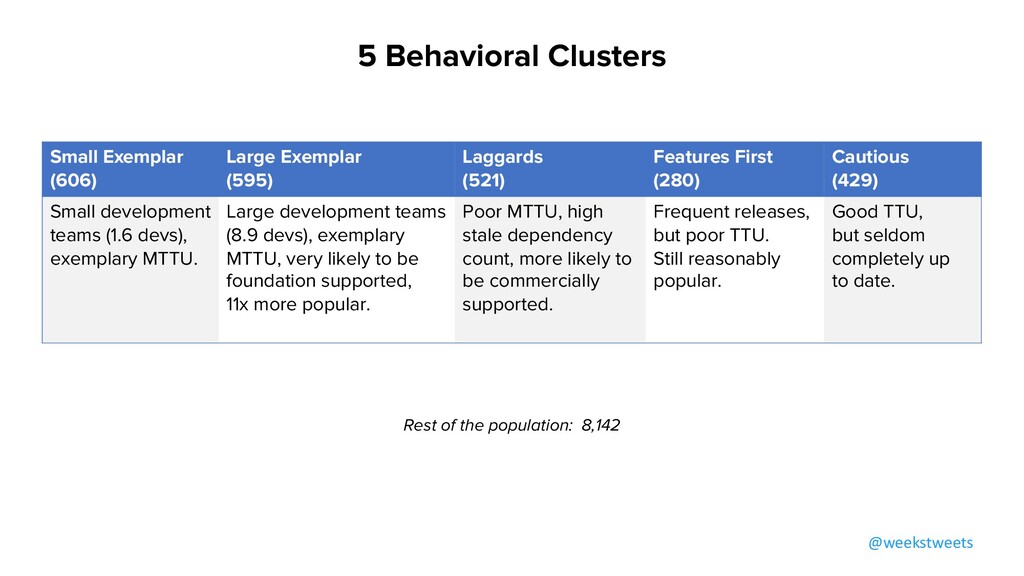 Laggards (521) Features First (280) Cautious (429) Small development teams (1.6 devs), exemplary MTTU. Large development teams (8.9 devs), exemplary MTTU, very likely to be foundation supported, 11x more popular. Poor MTTU, high stale dependency count, more likely to be commercially supported. Frequent releases, but poor TTU. Still reasonably popular. Good TTU, but seldom completely up to date. Rest of the population: 8,142