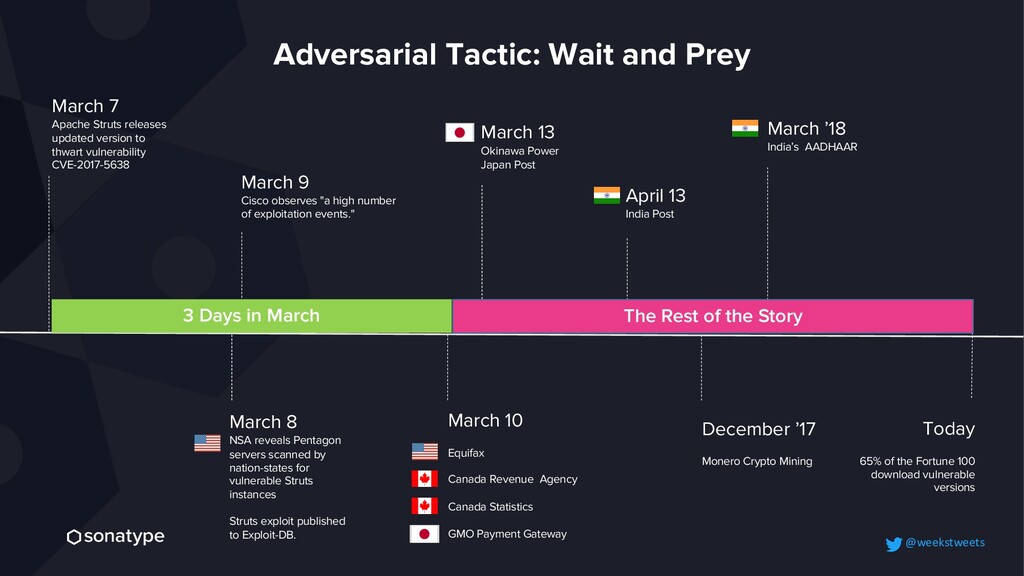 CVE-2017-5638 Today 65% of the Fortune 100 download vulnerable versions 3 Days in March March 8 NSA reveals Pentagon servers scanned by nation-states for vulnerable Struts instances Struts exploit published to Exploit-DB. March 10 Equifax Canada Revenue Agency Canada Statistics GMO Payment Gateway The Rest of the Story March 13 Okinawa Power Japan Post March 9 Cisco observes "a high number of exploitation events." March ’18 India’s AADHAAR April 13 India Post December ’17 Monero Crypto Mining Adversarial Tactic: Wait and Prey @weekstweets