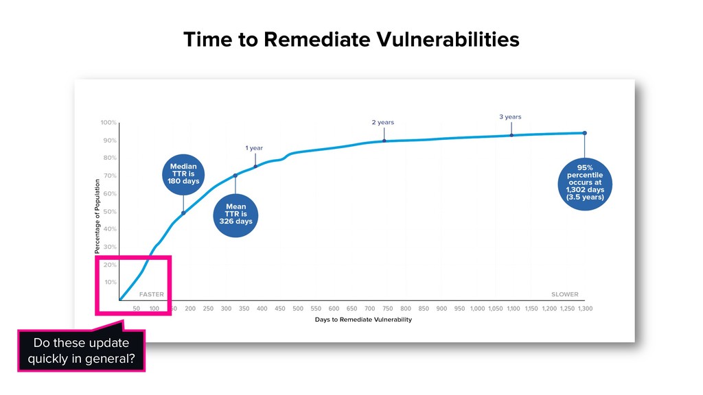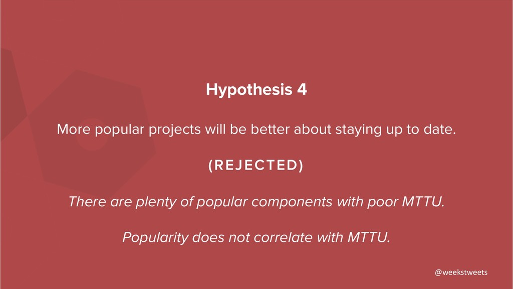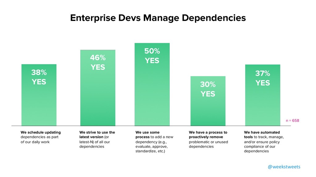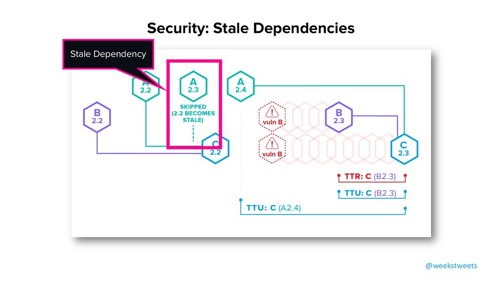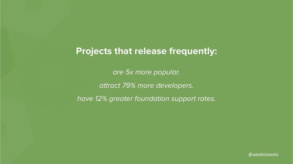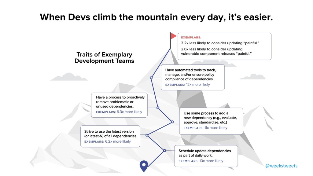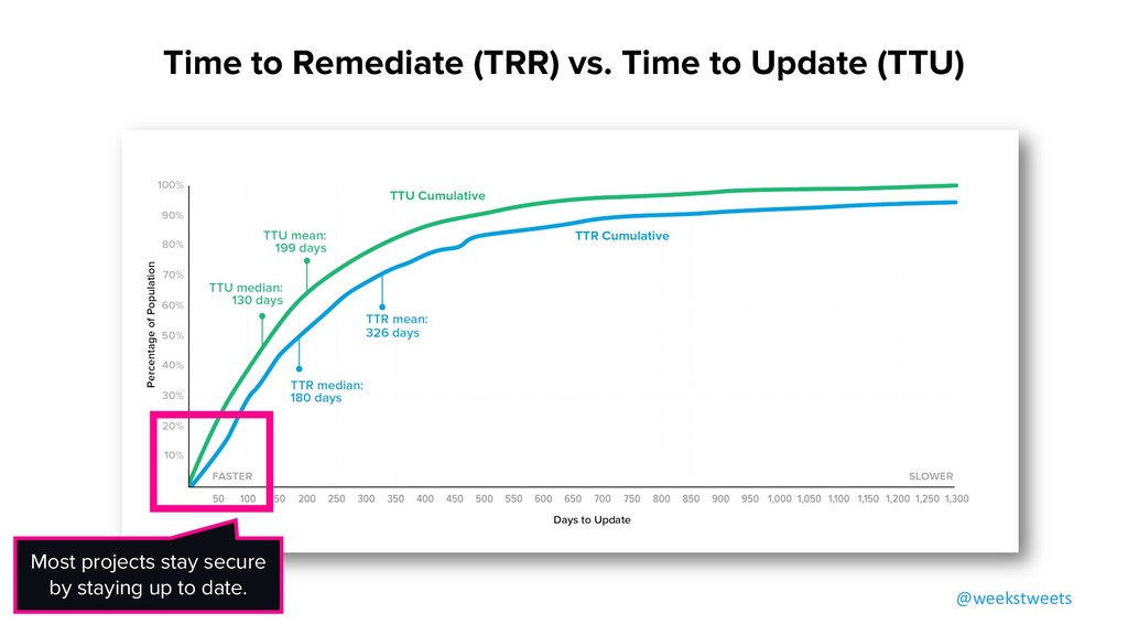 Laggards (521) Features First (280) Cautious (429) Small development teams (1.6 devs), exemplary MTTU. Large development teams (8.9 devs), exemplary MTTU, very likely to be foundation supported, 11x more popular. Poor MTTU, high stale dependency count, more likely to be commercially supported. Frequent releases, but poor TTU. Still reasonably popular. Good TTU, but seldom completely up to date. Rest of the population: 8,142