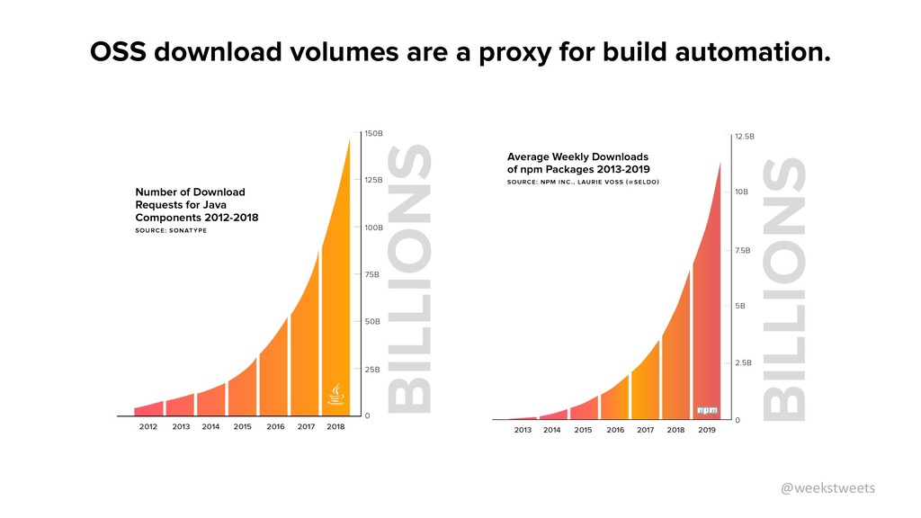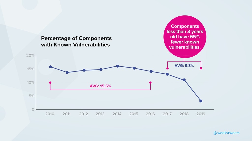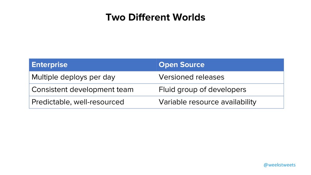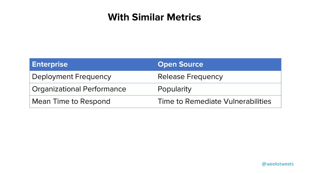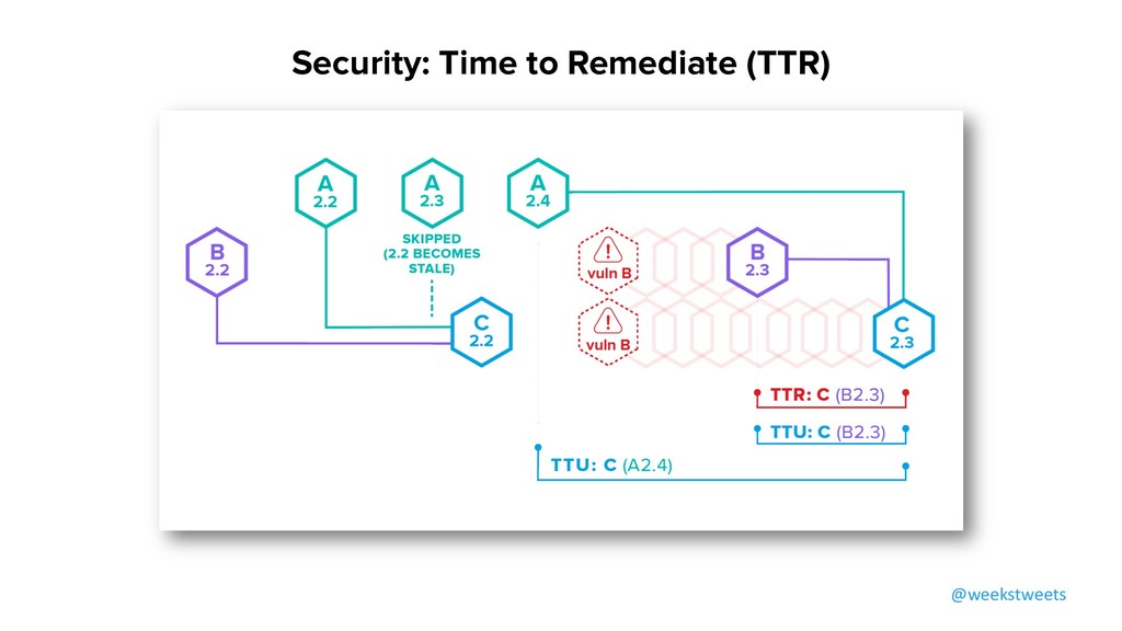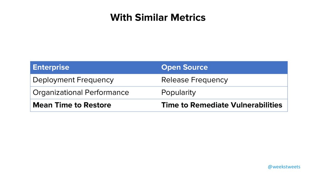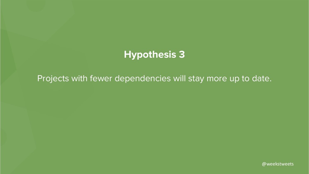 Laggards (521) Features First (280) Cautious (429) Small development teams (1.6 devs), exemplary MTTU. Large development teams (8.9 devs), exemplary MTTU, very likely to be foundation supported, 11x more popular. Poor MTTU, high stale dependency count, more likely to be commercially supported. Frequent releases, but poor TTU. Still reasonably popular. Good TTU, but seldom completely up to date. Rest of the population: 8,142