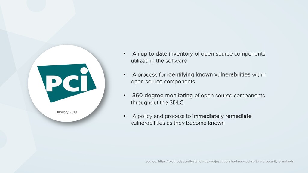 in the software • A process for identifying known vulnerabilities within open source components • 360-degree monitoring of open source components throughout the SDLC • A policy and process to immediately remediate vulnerabilities as they become known January 2019 source: https://blog.pcisecuritystandards.org/just-published-new-pci-software-security-standards