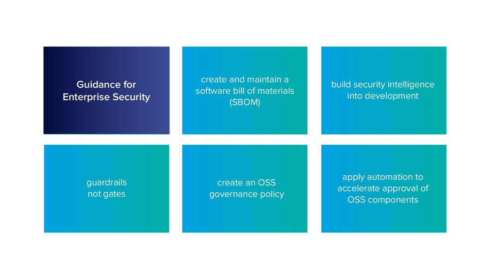 software bill of materials (SBOM) build security intelligence into development create an OSS governance policy apply automation to accelerate approval of OSS components Guidance for Enterprise Security guardrails not gates