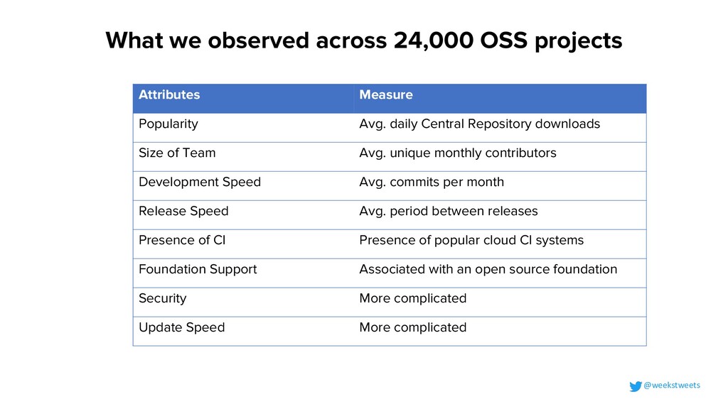 Team Avg. unique monthly contributors Development Speed Avg. commits per month Release Speed Avg. period between releases Presence of CI Presence of popular cloud CI systems Foundation Support Associated with an open source foundation Security More complicated Update Speed More complicated @weekstweets What we observed across 24,000 OSS projects