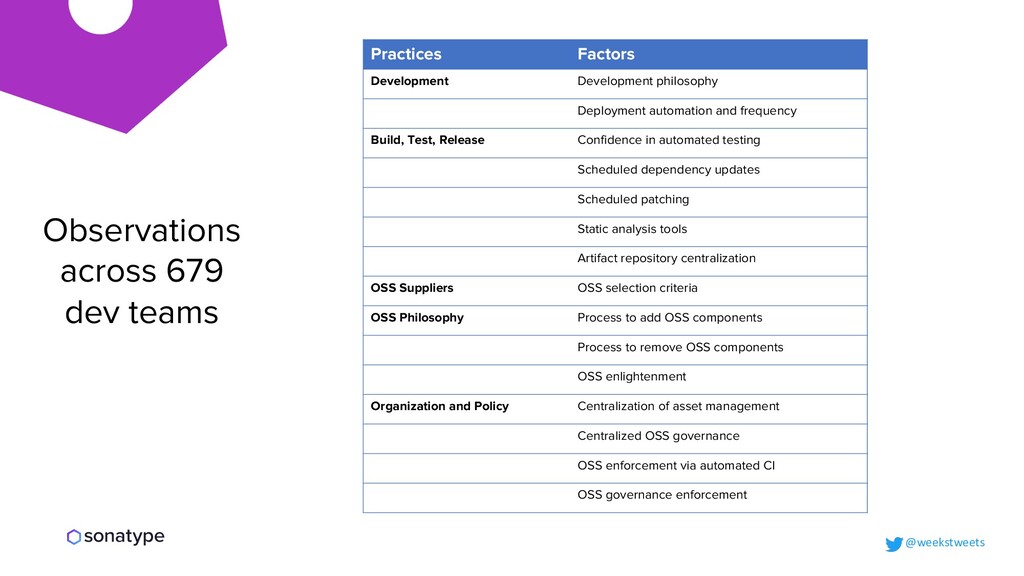 Test, Release Confidence in automated testing Scheduled dependency updates Scheduled patching Static analysis tools Artifact repository centralization OSS Suppliers OSS selection criteria OSS Philosophy Process to add OSS components Process to remove OSS components OSS enlightenment Organization and Policy Centralization of asset management Centralized OSS governance OSS enforcement via automated CI OSS governance enforcement @weekstweets Observations across 679 dev teams