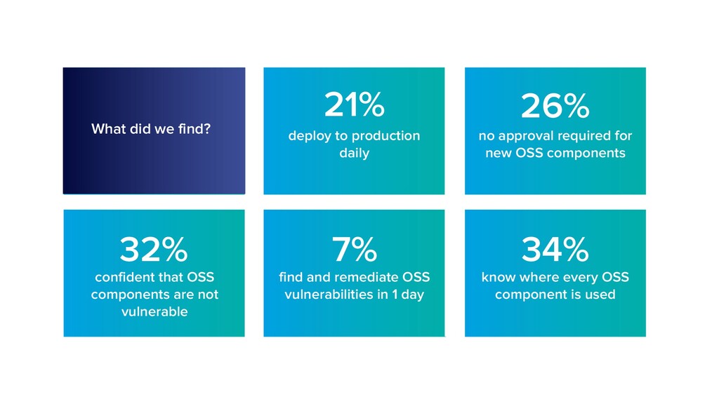 32% deploy to production daily no approval required for new OSS components find and remediate OSS vulnerabilities in 1 day know where every OSS component is used confident that OSS components are not vulnerable What did we find?