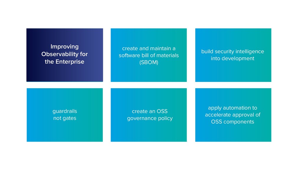 software bill of materials (SBOM) build security intelligence into development create an OSS governance policy apply automation to accelerate approval of OSS components Improving Observability for the Enterprise guardrails not gates