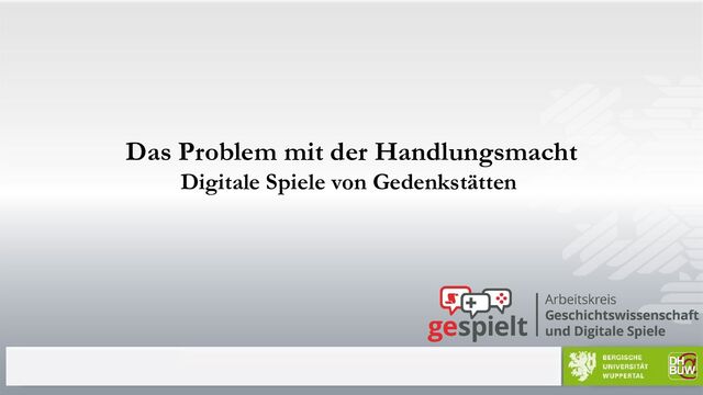Christian Günther | WissMa DH@BUW || 05.06.2023 Eines der Kernelemente eines Spieles ist die Handlungsmacht des Spielenden, mit der aber, so Nico Nolden, „jedes Spiel von einer exakten historischen Rekonstruktion ab[weicht], will man es nicht so linear und eng führen, dass es seinen Charakter als Spiel verliert.“ Nico Nolden: Geschichte und Erinnerung in Computerspielen, Berlin, Boston: De Gruyter 2019, S. 83.