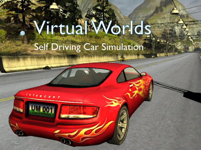 We discuss the challenges and advantages of using a virtual world to test out algorithms for the self-driving car.