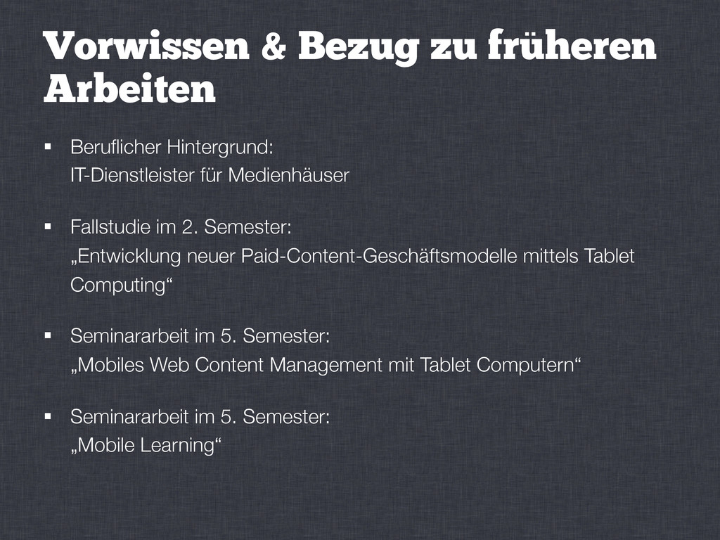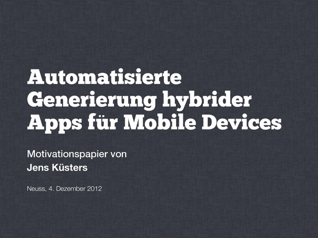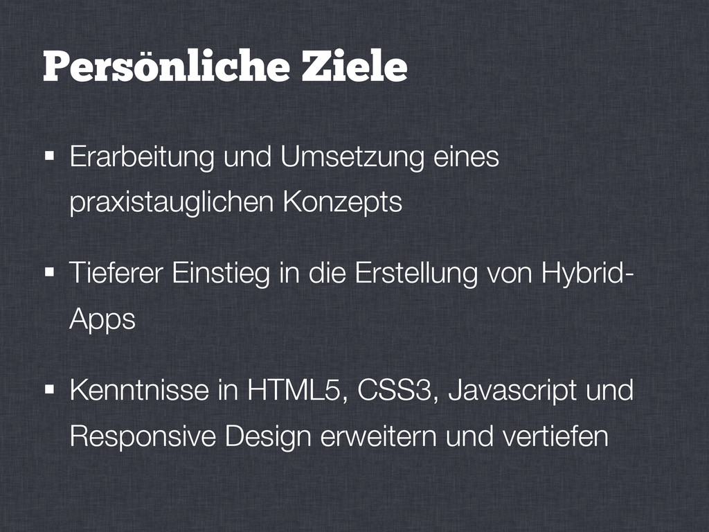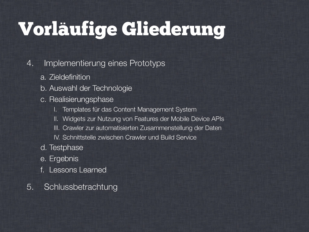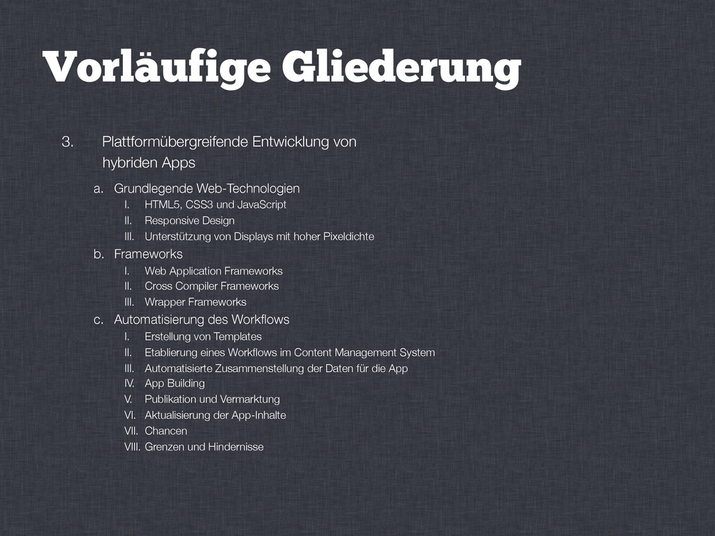 Grundlegende Web-Technologien I. HTML5, CSS3 und JavaScript II. Responsive Design III. Unterstützung von Displays mit hoher Pixeldichte b. Frameworks I. Web Application Frameworks II. Cross Compiler Frameworks III. Wrapper Frameworks c. Automatisierung des Workflows I. Erstellung von Templates II. Etablierung eines Workflows im Content Management System III. Automatisierte Zusammenstellung der Daten für die App IV. App Building V. Publikation und Vermarktung VI. Aktualisierung der App-Inhalte VII. Chancen VIII. Grenzen und Hindernisse